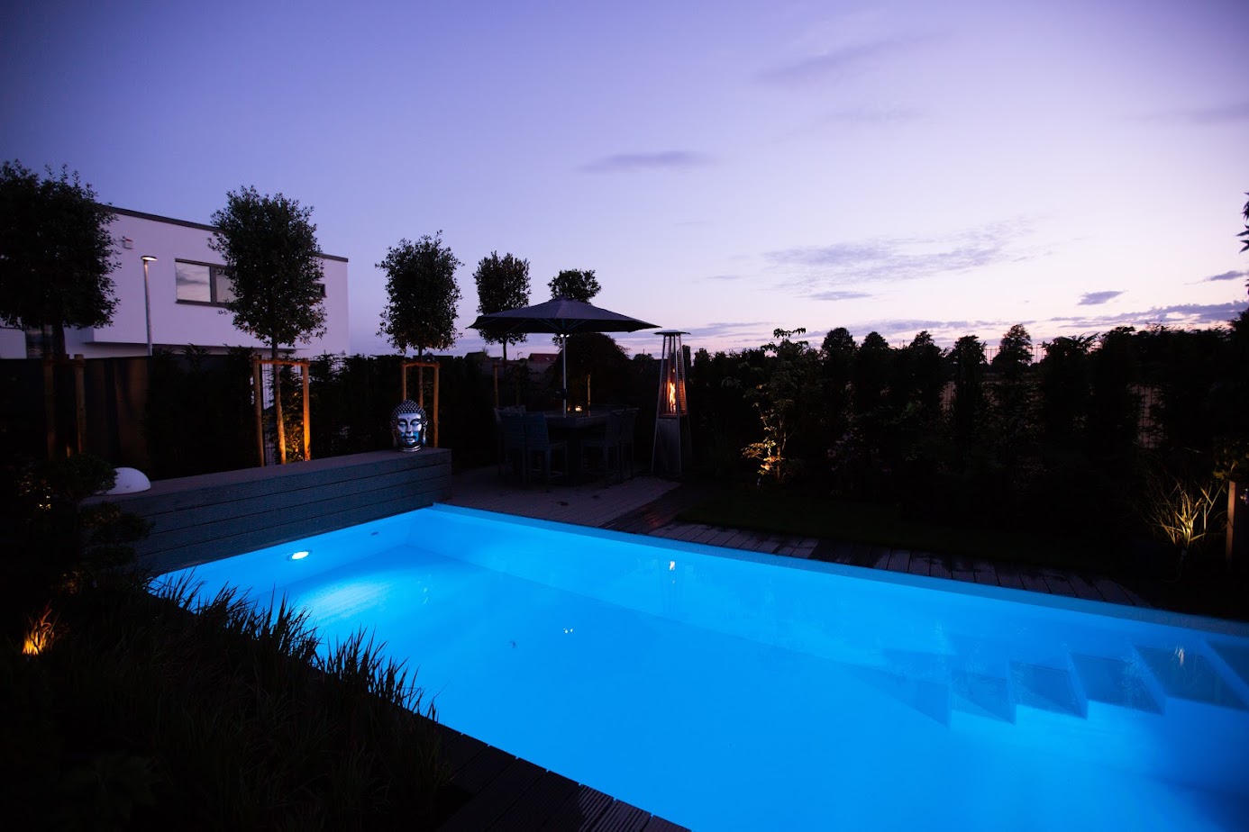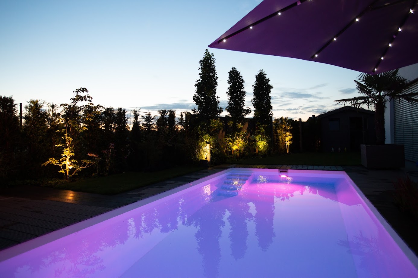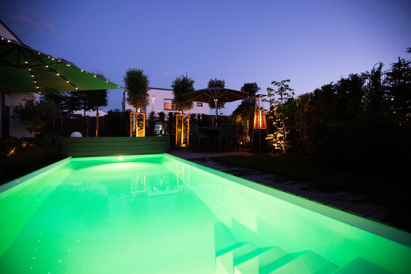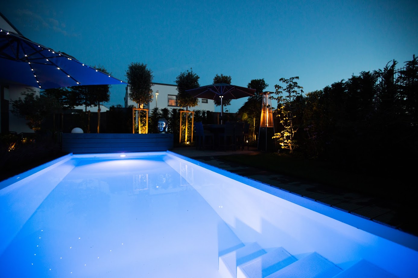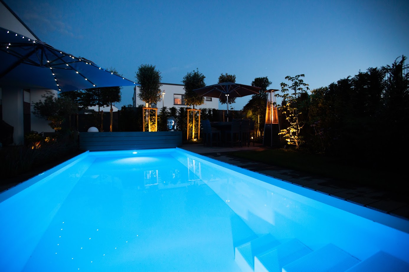 Sobald die Sonne untergeht, beginnt die Magie. Moderne LED-Beleuchtung taucht das Fertigbecken in sanfte Farben oder lebendige Lichtakzente. Das Wasser schimmert, der Alltag tritt in den Hintergrund. Ob ruhiger Sommerabend oder ausgelassene Poolparty – das Licht passt sich Ihrer Stimmung an und macht jeden Moment besonders.