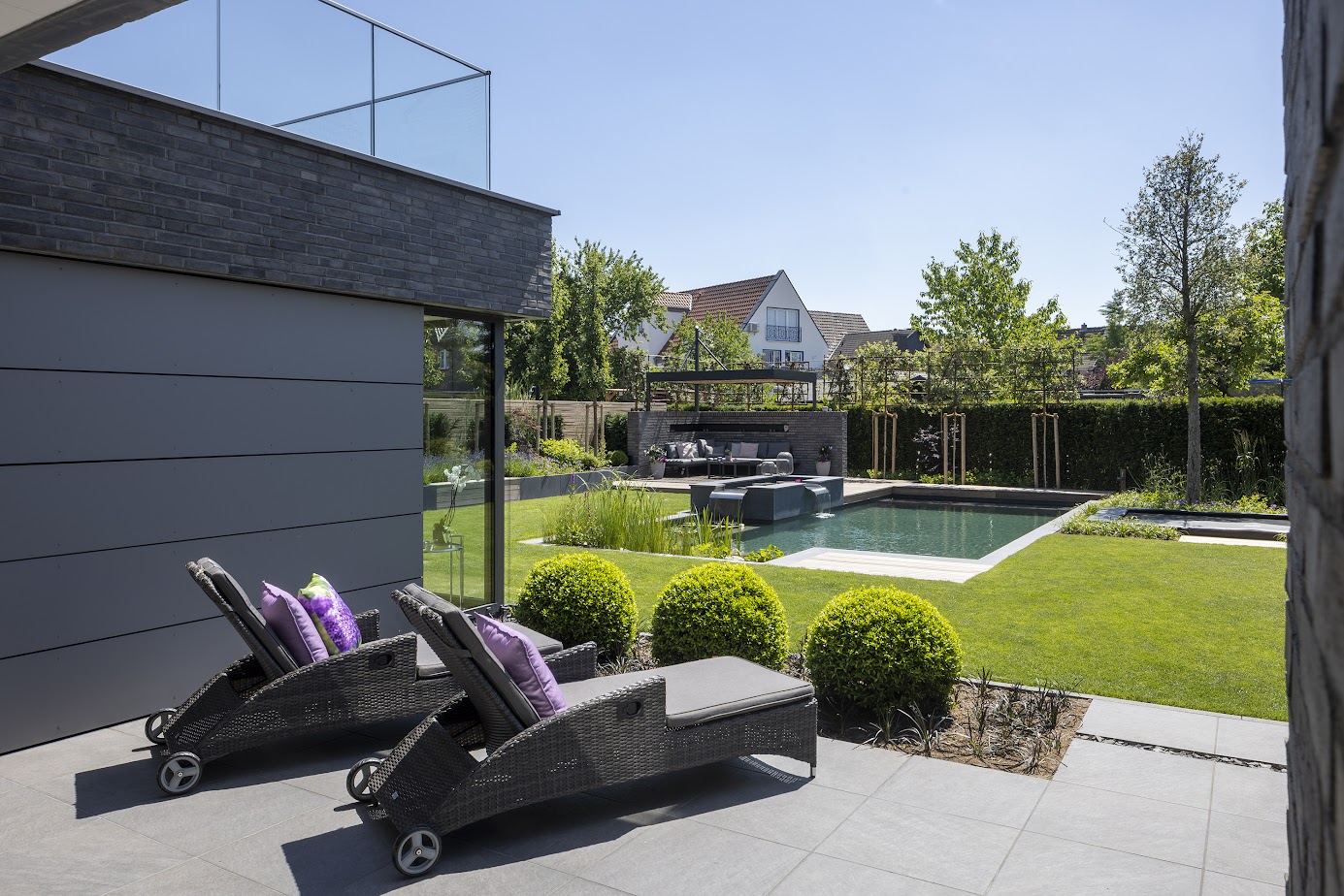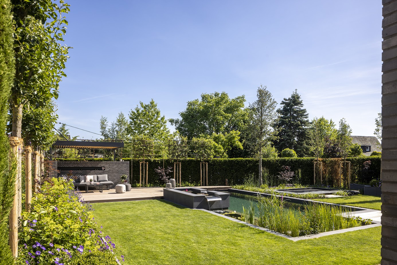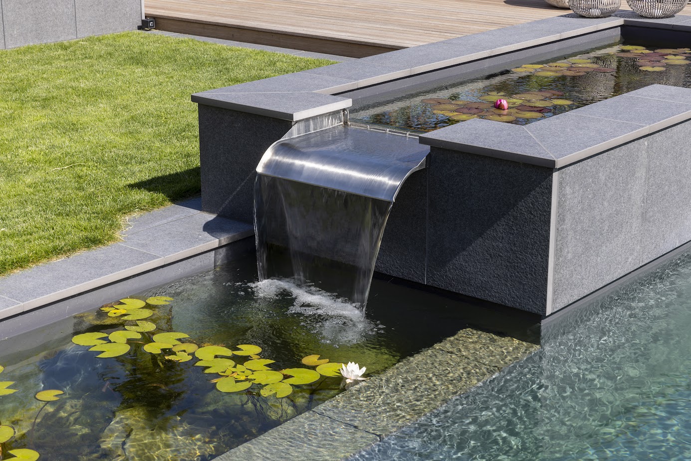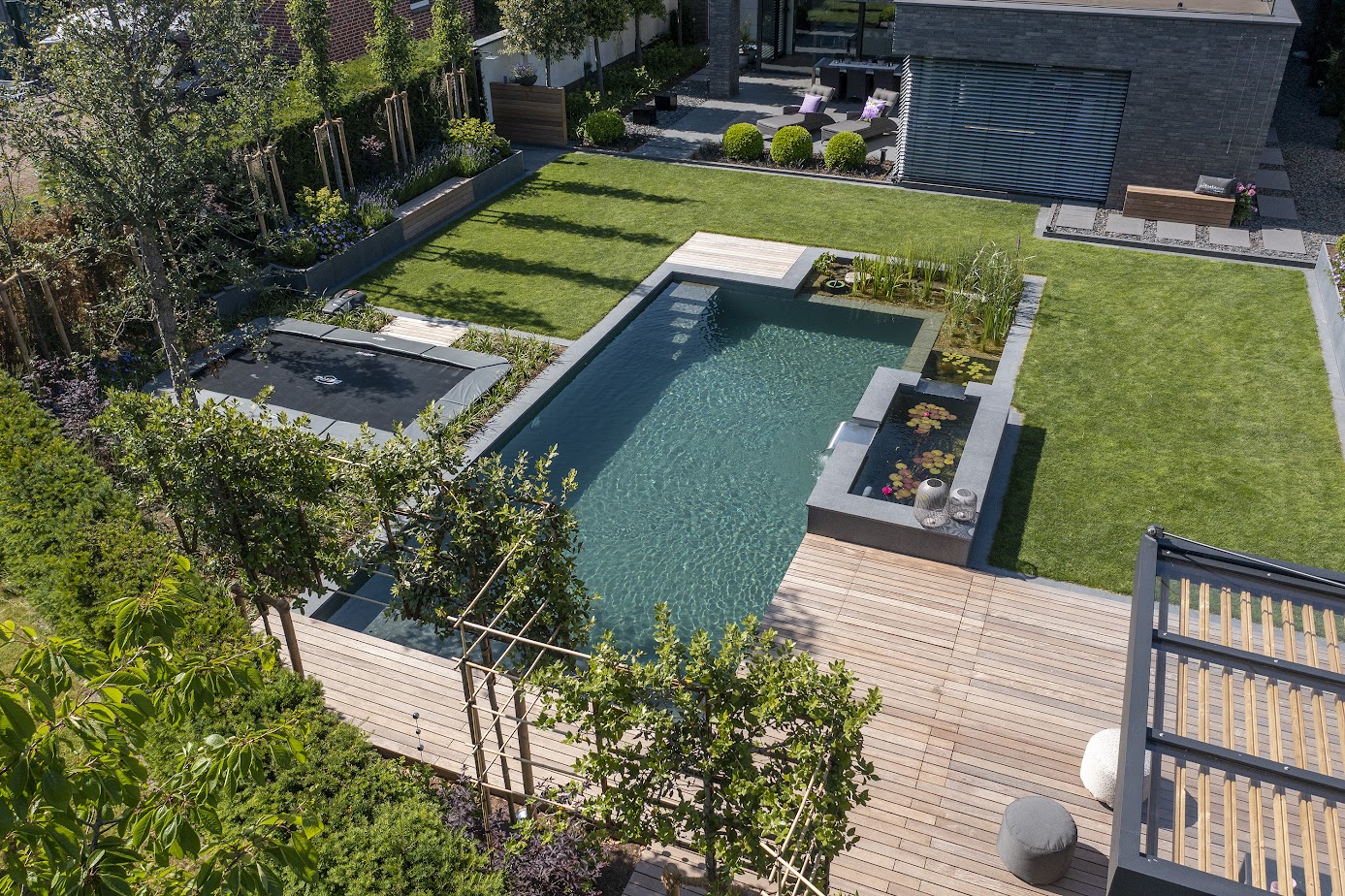 Die Wahl eines biologischen Schwimmteiches war ausdrücklicher Wunsch der Bauherren. Seerosen und Wasserpflanzen prägen die Regenerationszone und halten den Schwimmteich auf natürliche Weise klar. Gleichzeitig entsteht ein lebendiger Raum für Insekten und Vögel – ein Garten, der nicht nur schön ist, sondern auch der Natur etwas gibt.