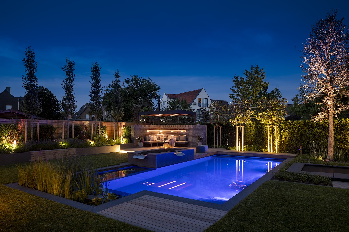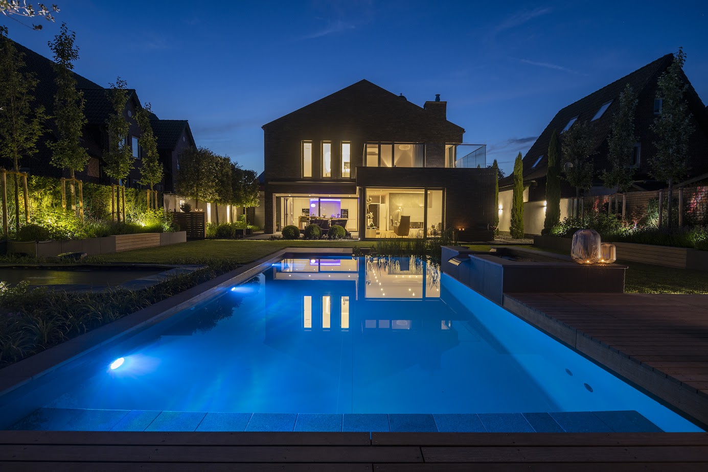 Wasser als Erlebnisraum: Der Schwimmteich ist Herzstück und Bühne zugleich. Morgens lockt er zu sportlichen Bahnen, tagsüber wird er zum Ort für Bewegung, Spiel und unbeschwerte Sprünge ins kühle Nass. Mit Einbruch der Dämmerung verwandelt sich der Schwimmteich in eine schimmernde blaue Lagune. Licht und Wasser verschmelzen zu einer Atmosphäre, die Ruhe ausstrahlt und den Alltag in den Hintergrund treten lässt.