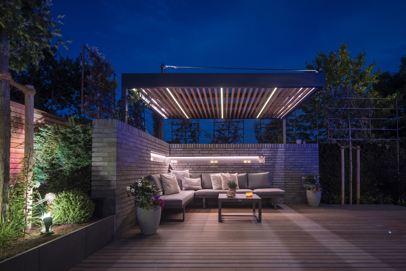 Spalierbäume rahmen das Grundstück und schaffen eine geschützte, fast private Welt. Unterschiedliche Sitz- und Liegeplätze laden dazu ein, innezuhalten, den Blick über das Wasser schweifen zu lassen und den Garten immer wieder neu zu entdecken – im Sonnenlicht wie in der beleuchteten Abendstimmung.