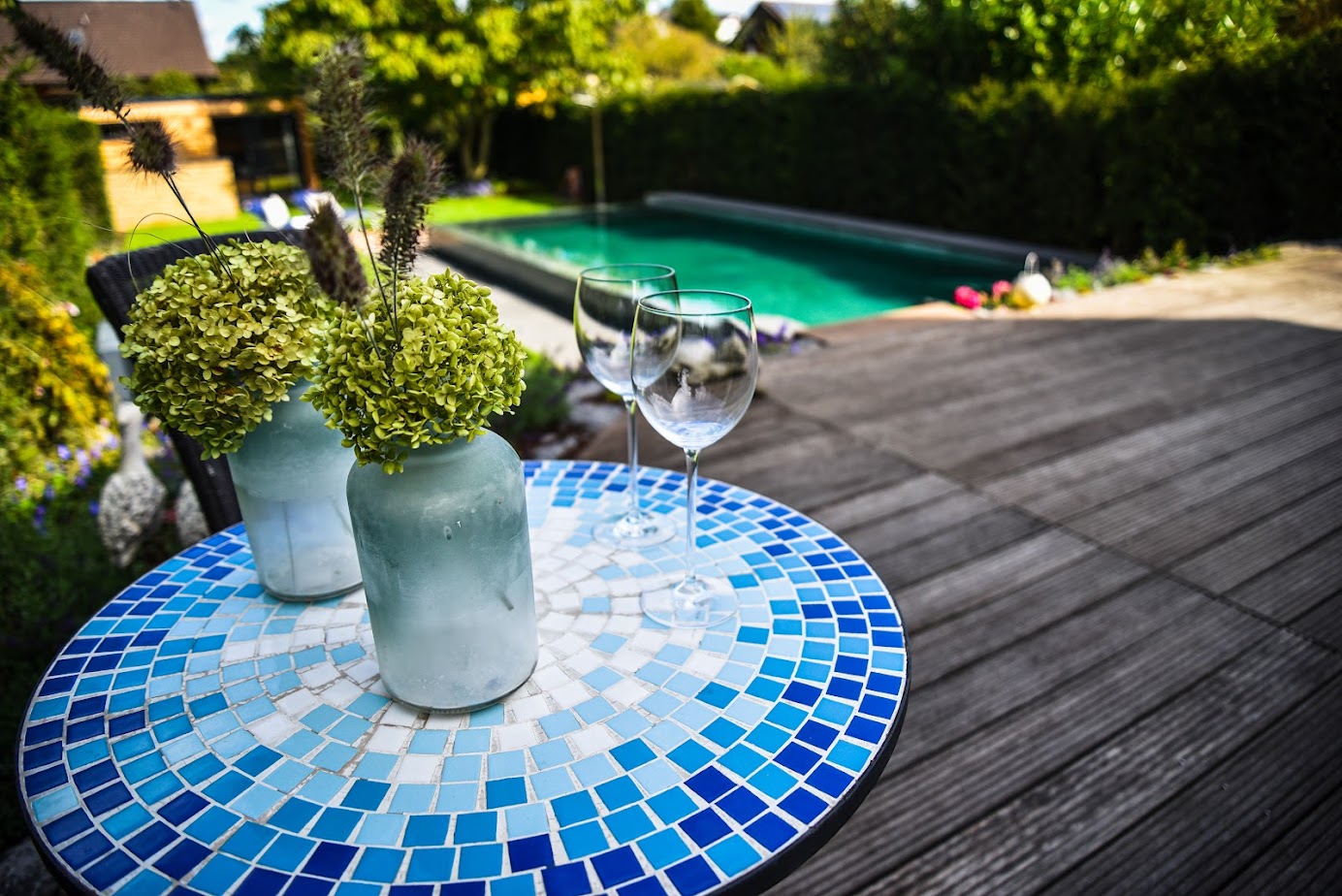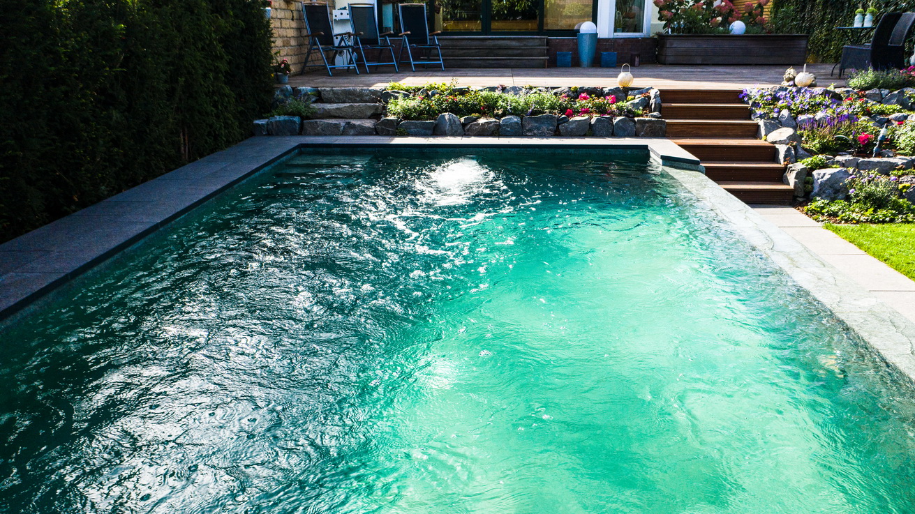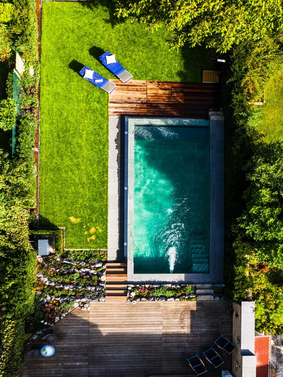 Die Lage des Pools schafft unterschiedliche Sonnen- und Schattenzonen, sodass zu jeder Tageszeit ein passender Platz zum Entspannen vorhanden ist.