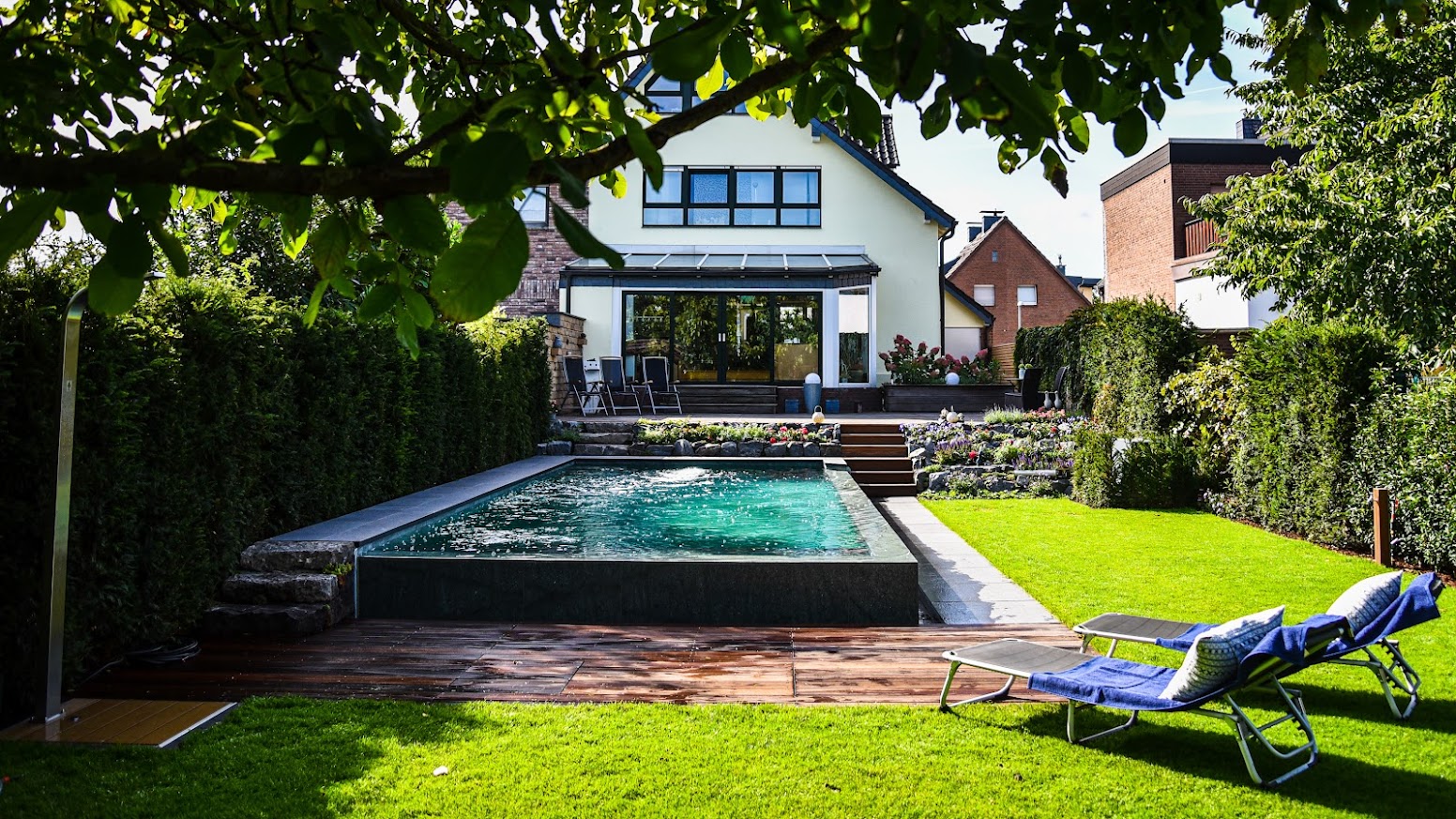 Ein durchgängiges Gestaltungskonzept war zentral für diesen Garten. Das langgezogene Poolbecken verstärkt optisch die Tiefe des Grundstücks und lässt den Garten unglaublich großzügig wirken. Das Gefühl der Enge wurde vollständige aufgelöst. Diese Neuausrichtung steigert den Gesamtwert der Immobilie spürbar.