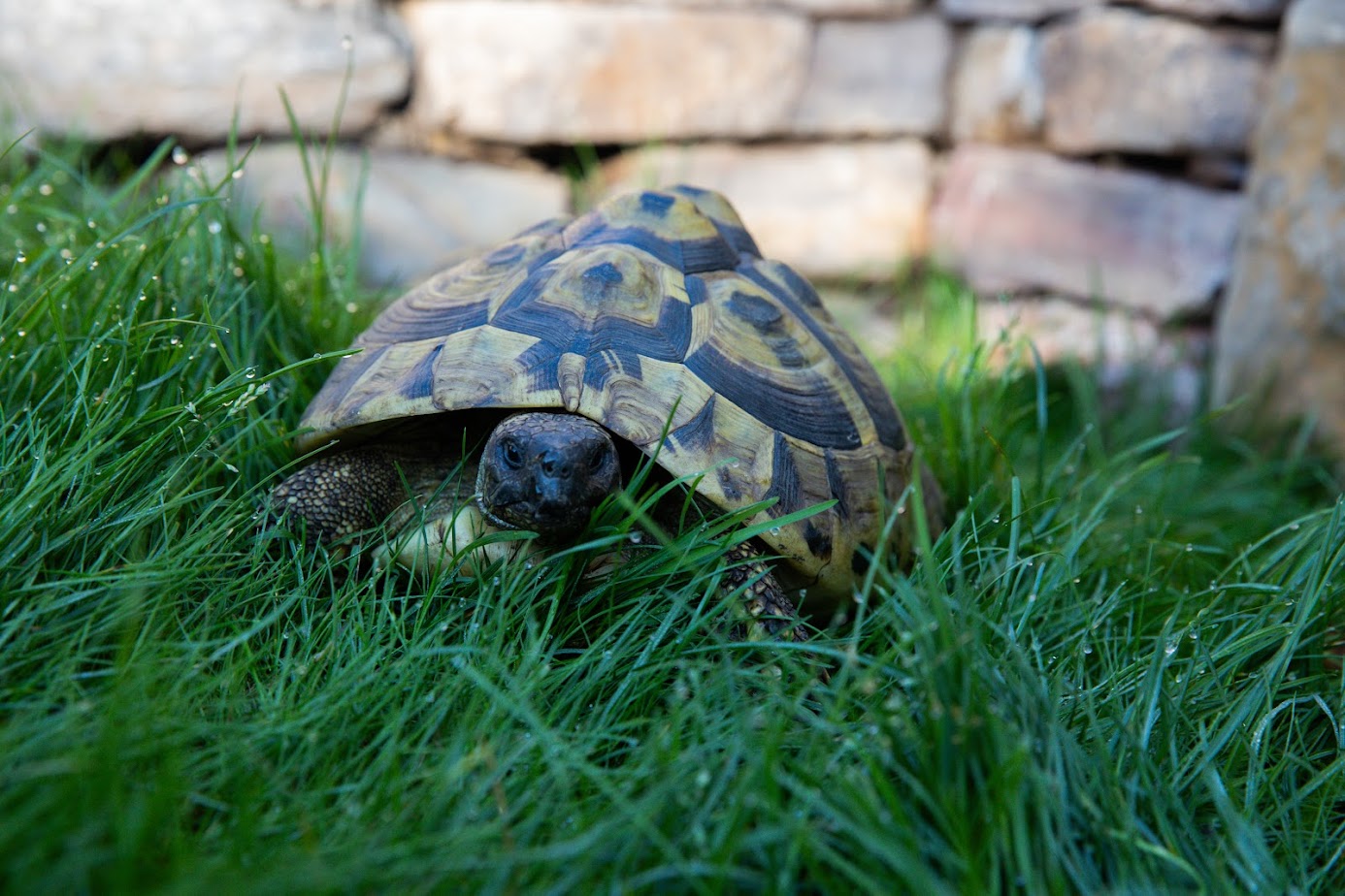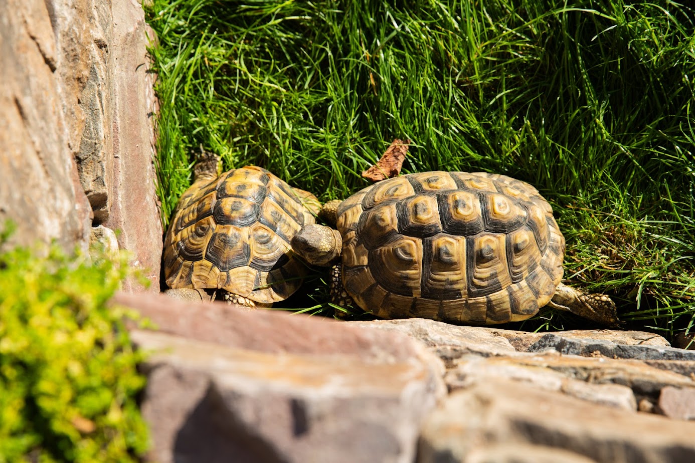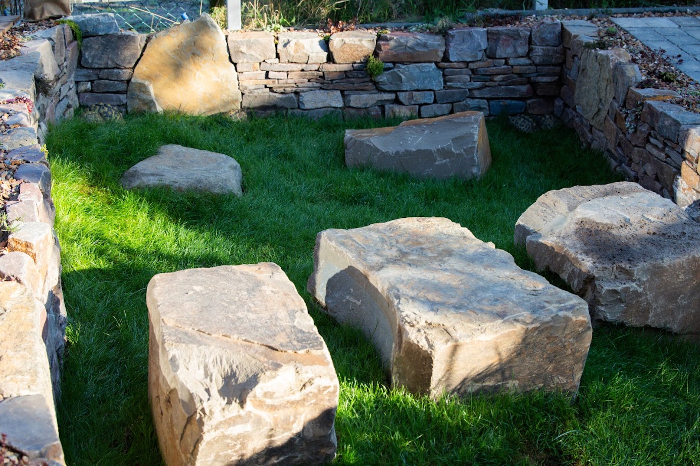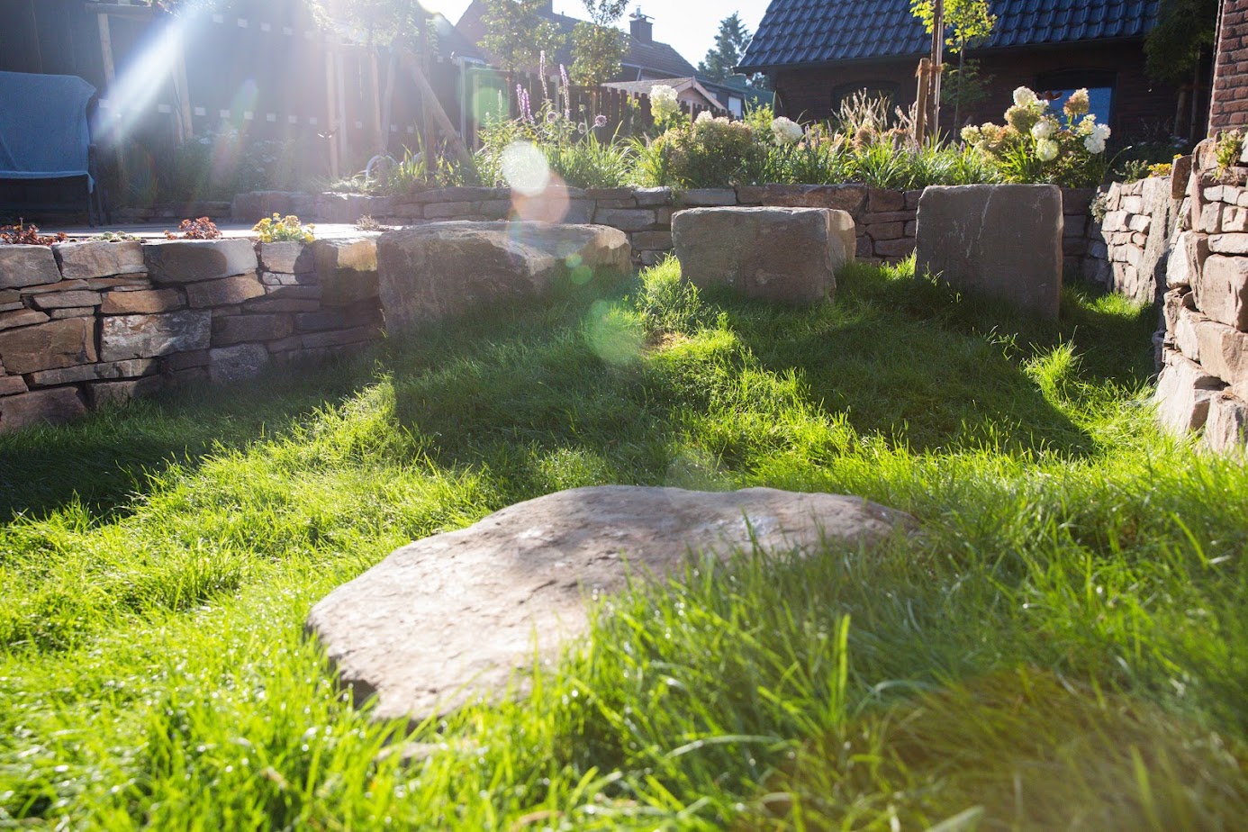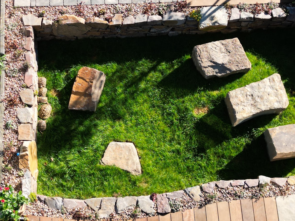 In diesem Garten stand jedoch noch etwas anderes im Mittelpunkt: besondere Mitbewohner. Für die Schildkröten der Familie entstand ein liebevoll gestalteter Senkgarten mit natürlicher Steineinfassung. Die Steine speichern die Sonnenwärme und schaffen ein geschütztes, warmes Mikroklima – ideal zum Verweilen und Aufwärmen. Durch die abgesenkte Gestaltung wirkt der Garten optisch größer, offener und deutlich lebendiger.