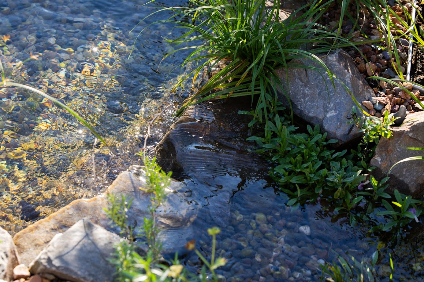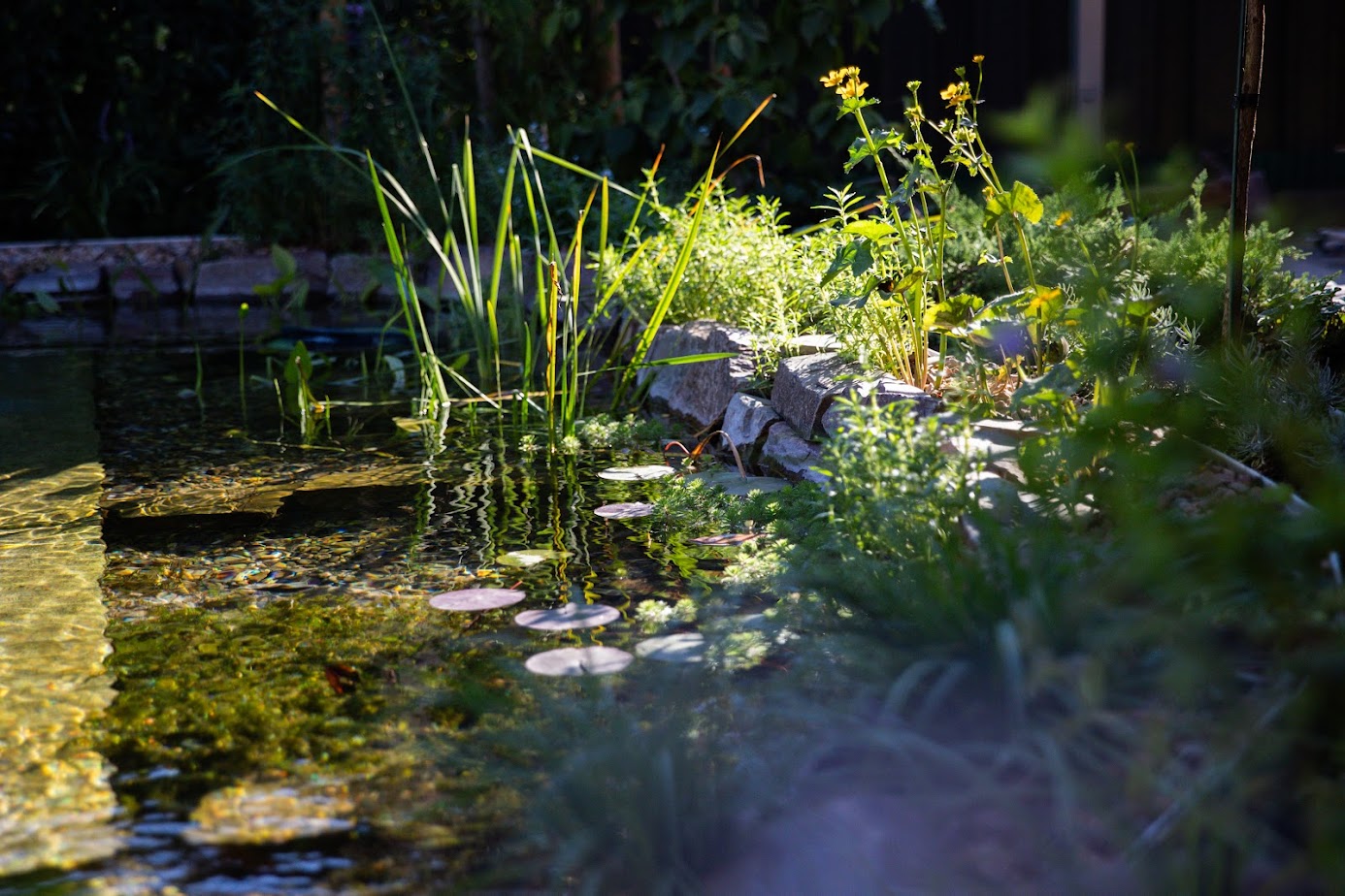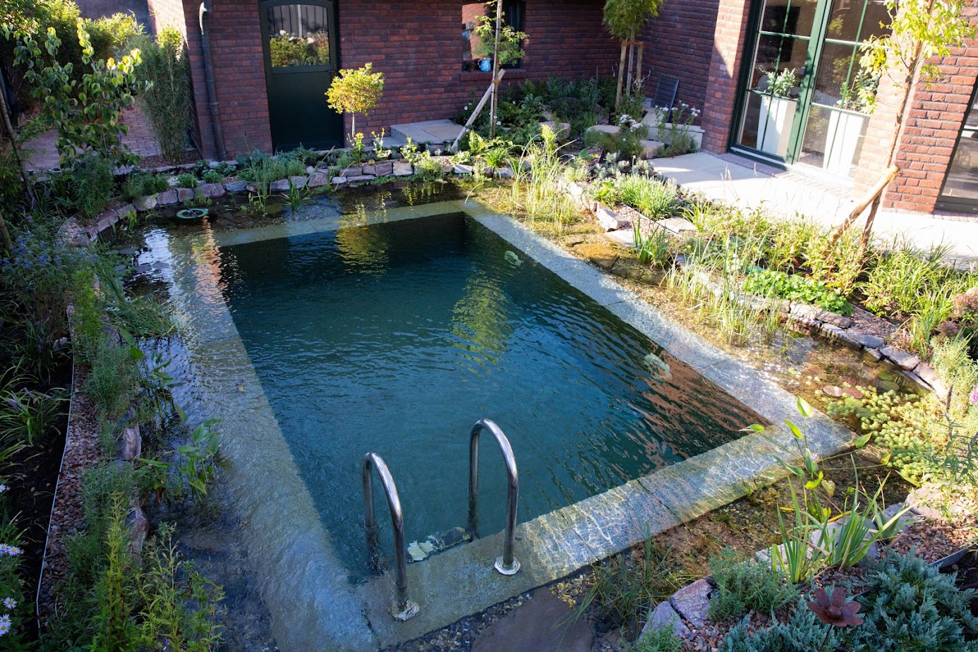 Üppige Pflanzen in unterschiedlichen Tiefenzonen sorgen für Farbe, Duft und ein wechselndes Bild im Laufe der Jahreszeiten. Gleichzeitig übernehmen sie eine wichtige Funktion: Als Regenerationszone reinigen sie das Wasser ganz natürlich.