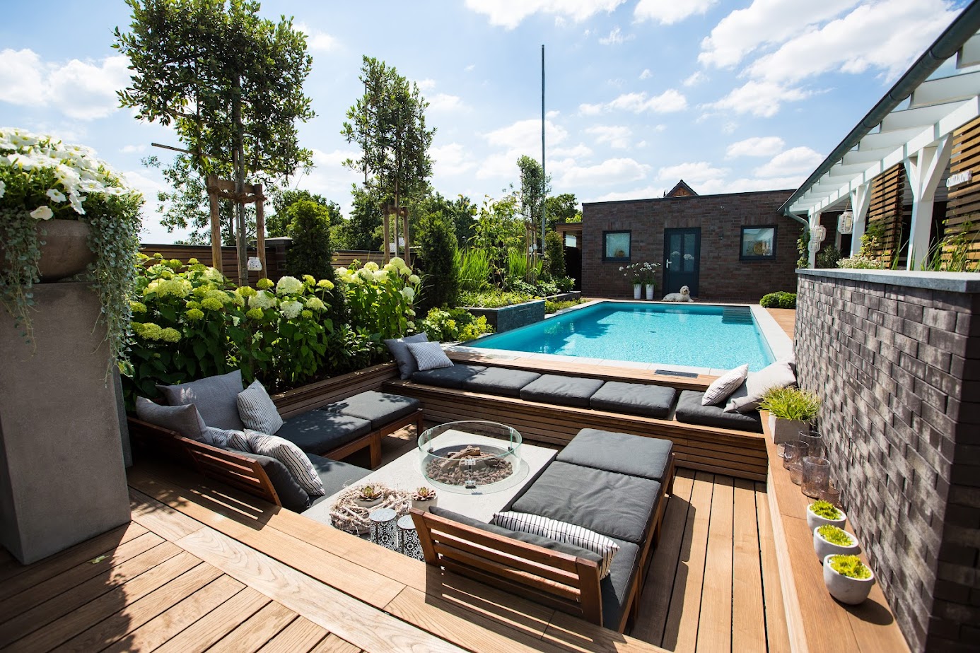 Holzsitzgarnitur Sitzecke neben einem Folienpool gebaut von Gartenbitters