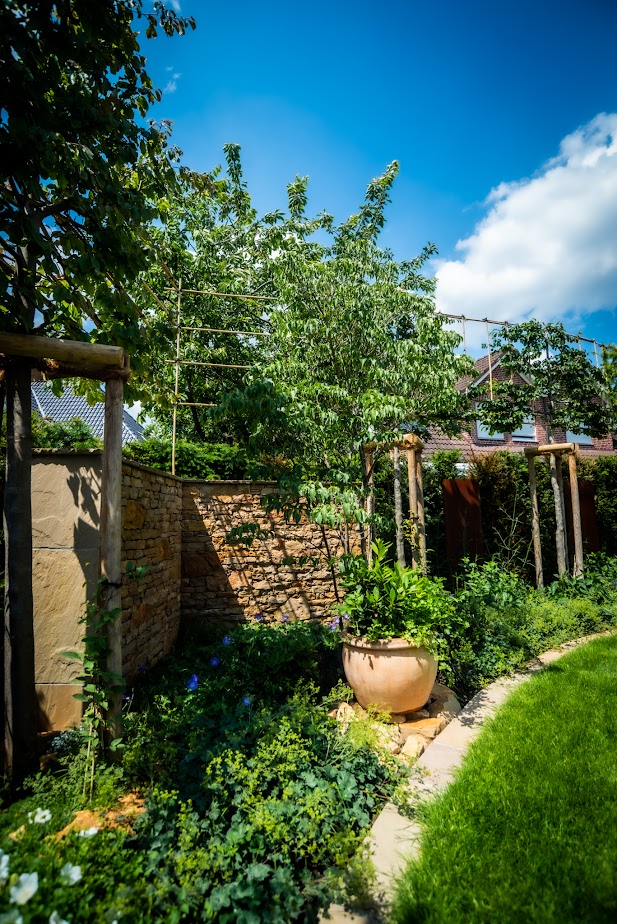 Spalierbäume aus Eisenholz, Zierapfel und eine bestehende Himalaya-Zeder schaffen einen Sichtschutz, der nicht trennt, sondern verbindet. Blüten, Früchte und wechselnde Strukturen verleihen dem Garten Tiefe und Lebendigkeit – ganz natürlich und mit Charakter.