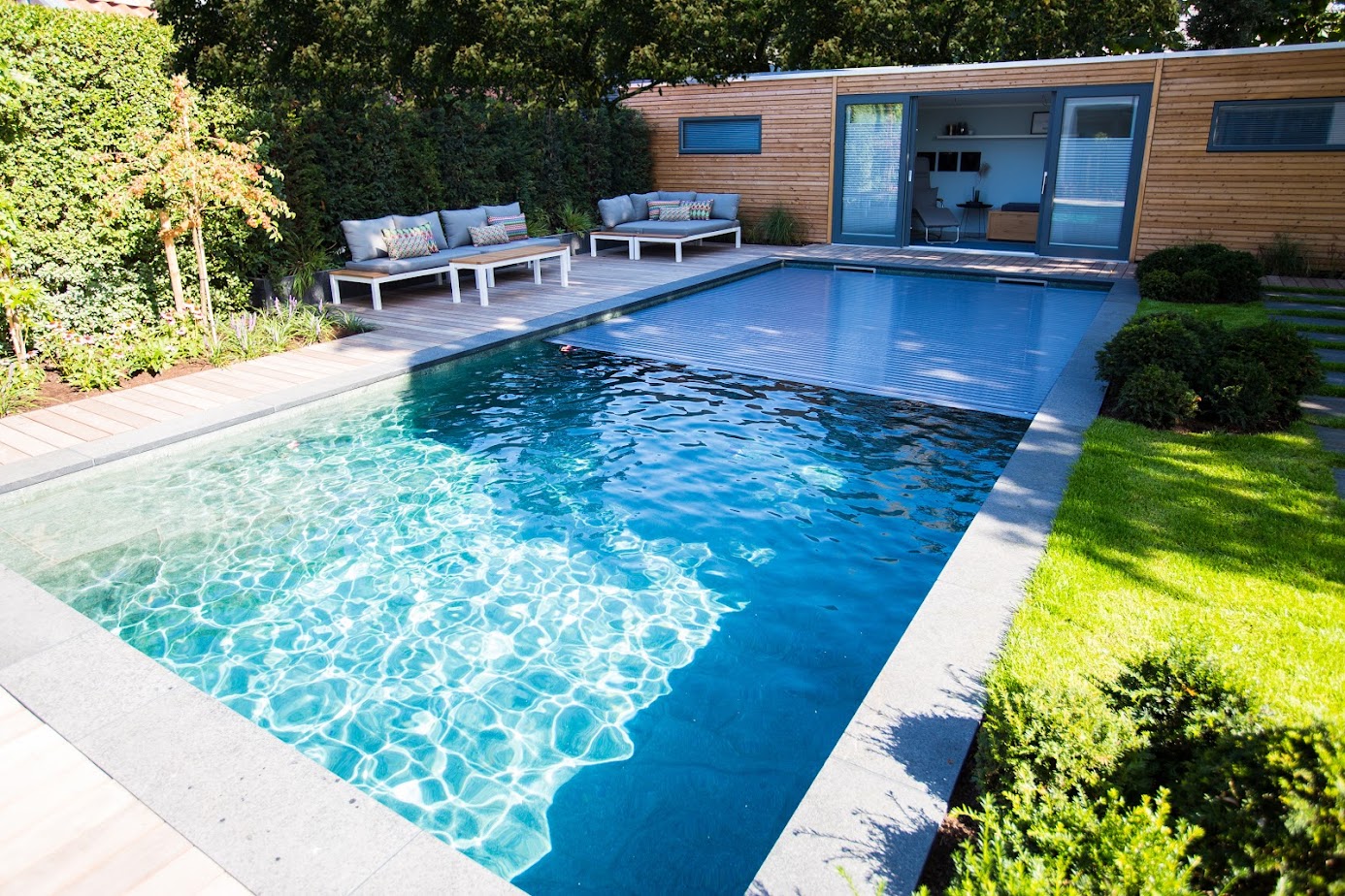 Ein Natursteinpool, eine kleine Terrasse und eine maßgeschneiderte Sauna ergänzen den Garten zu einem persönlichen Rückzugsort. Hier wird jede freie Stunde zur Erholung – selbst an Wochenenden mit wenig Zeit.