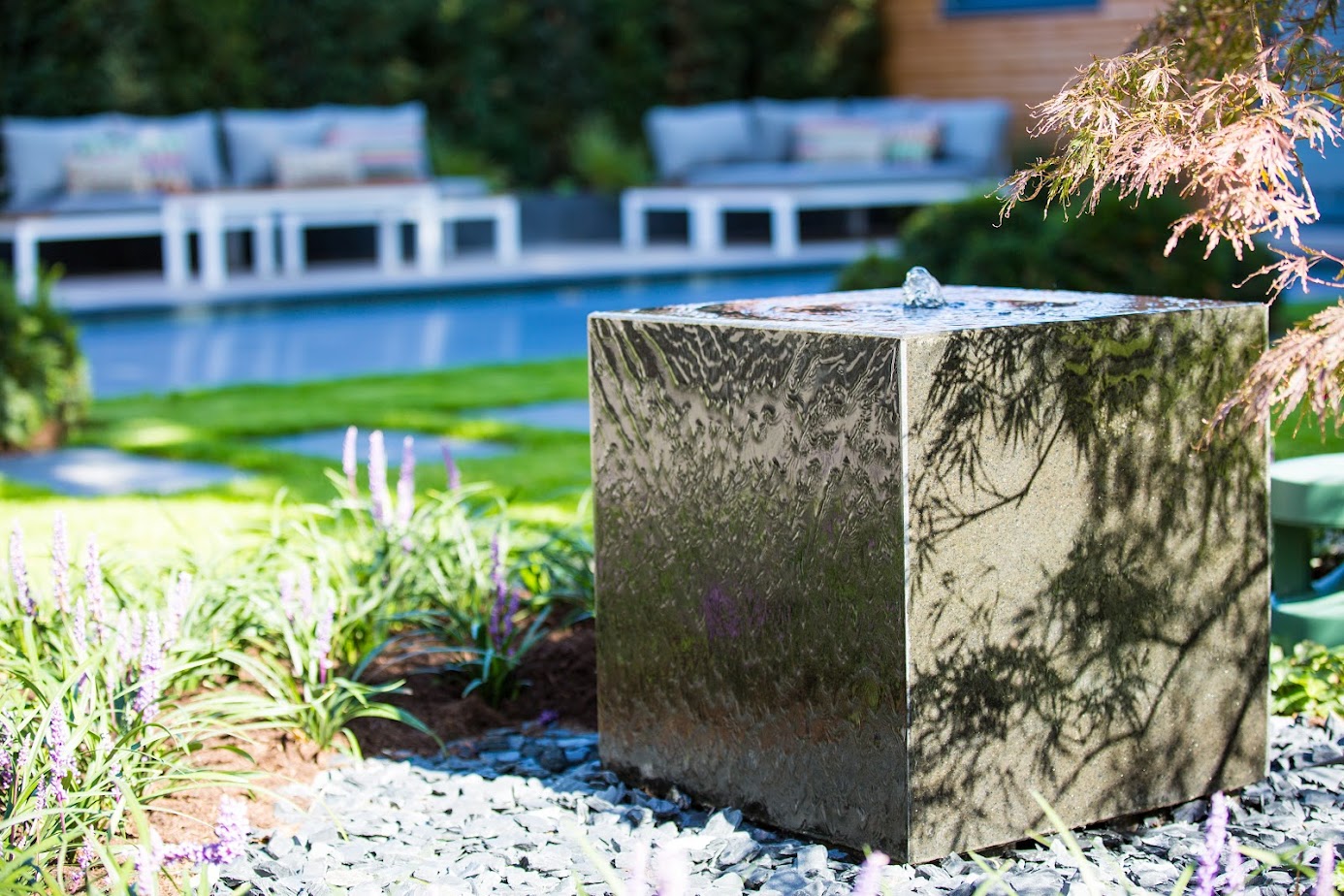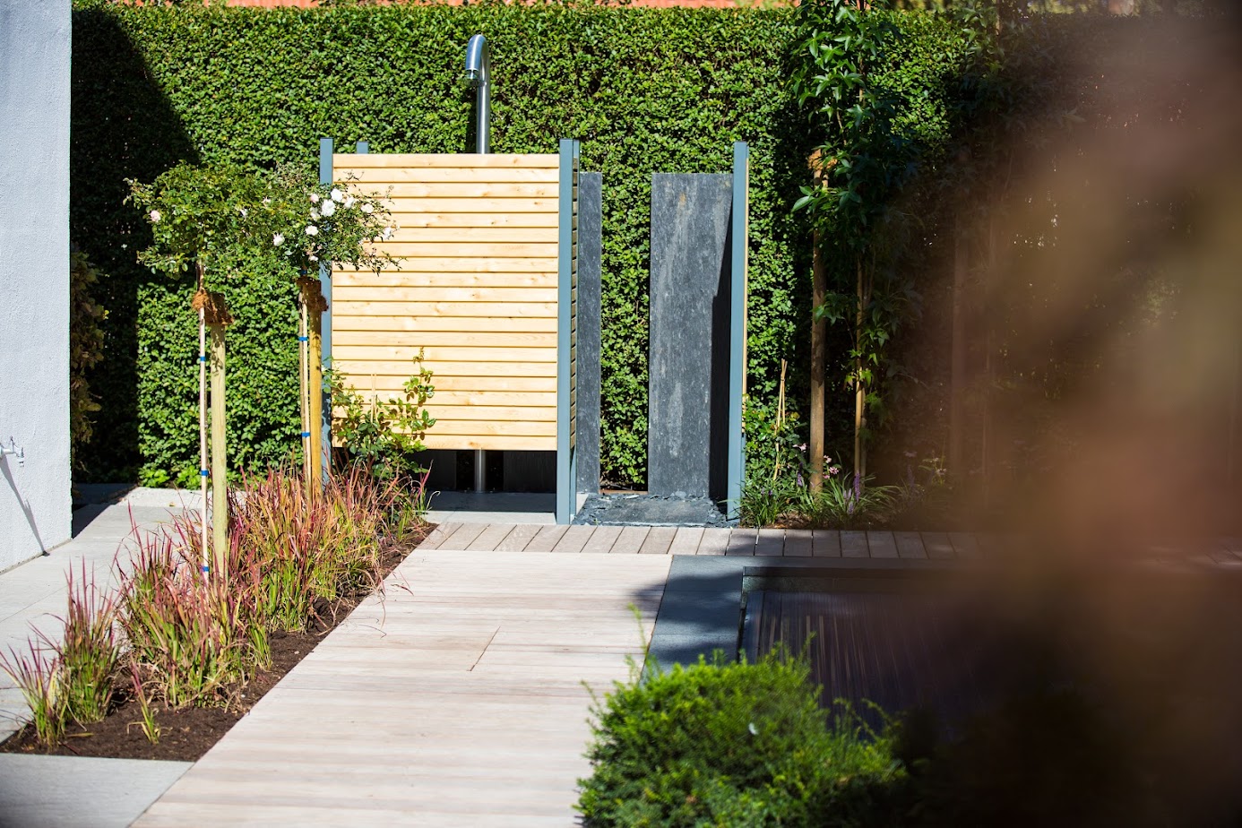 Wasserspiel, Outdoordusche und eine gemütliche Lounge-Ecke schaffen echtes Sommerfeeling. Der Garten wird zum Treffpunkt, zum Rückzugsort und zum Lieblingsplatz an warmen Tagen.