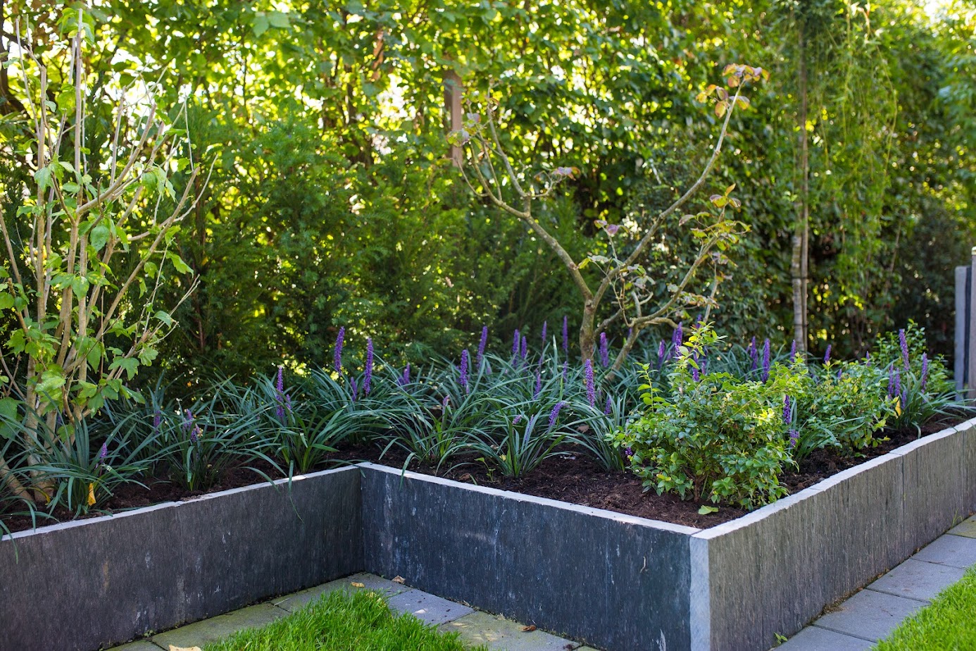 Damit die Buche ihre Wirkung entfalten kann, bleibt die Bepflanzung zurückhaltend. Pflegeleichte Stauden, früh blühende Pflanzen und Gehölze mit Herbstfärbung sorgen dennoch für Farbe, Struktur und Abwechslung im Jahresverlauf.