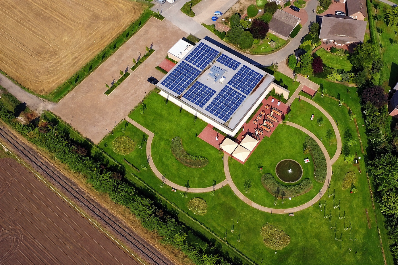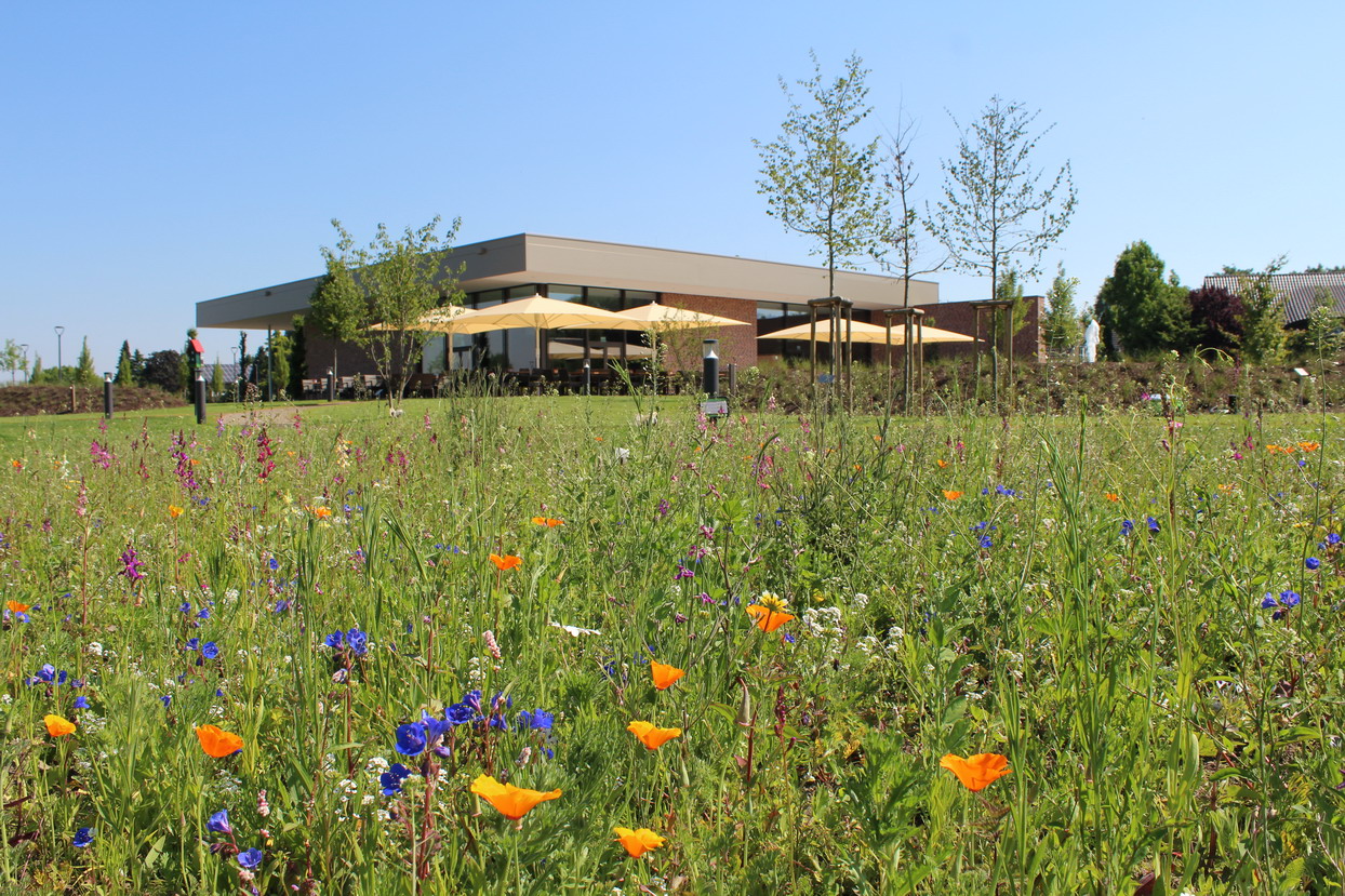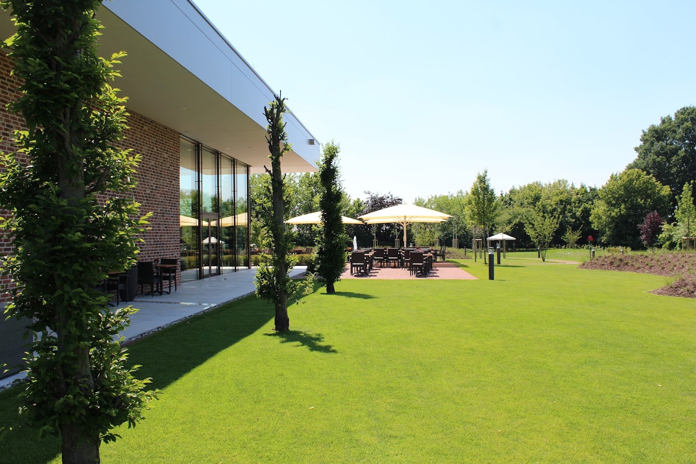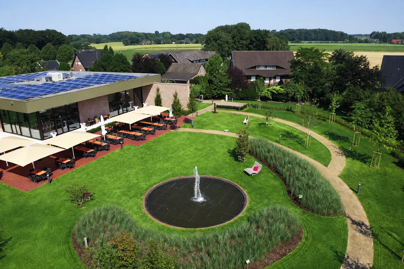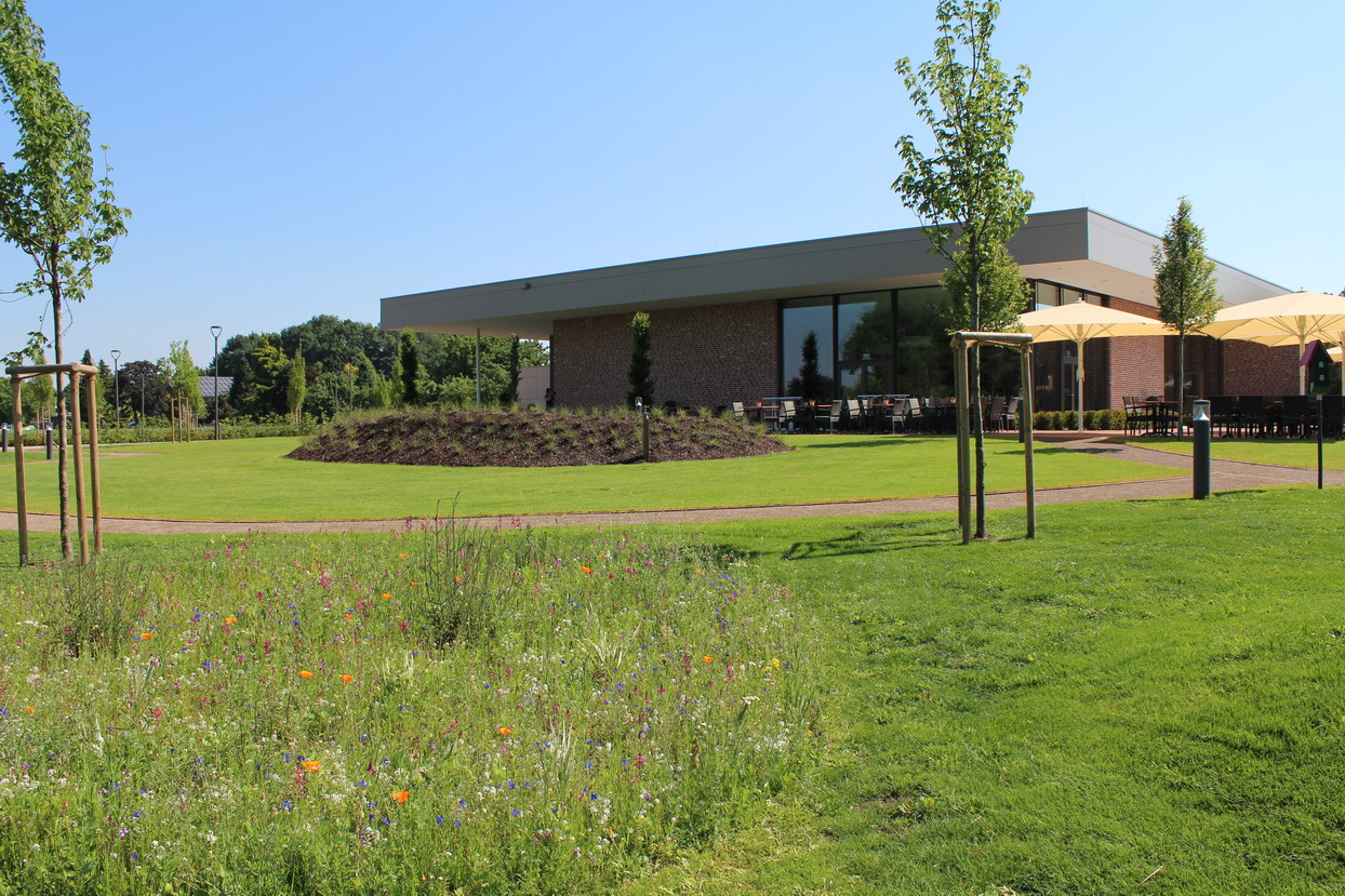 Die Materialwahl unterstreicht den authentischen Anspruch des Projekts. Klinkerpflaster im münsterländischen Stil verleiht der Terrasse Bodenständigkeit und Wertigkeit zugleich. Die wassergebundene Wegedecke im Parkplatzbereich wirkt zurückhaltend, ist funktional und nachhaltig – und lässt Raum für zukünftige Entwicklungen, ohne das Gesamtbild zu stören.