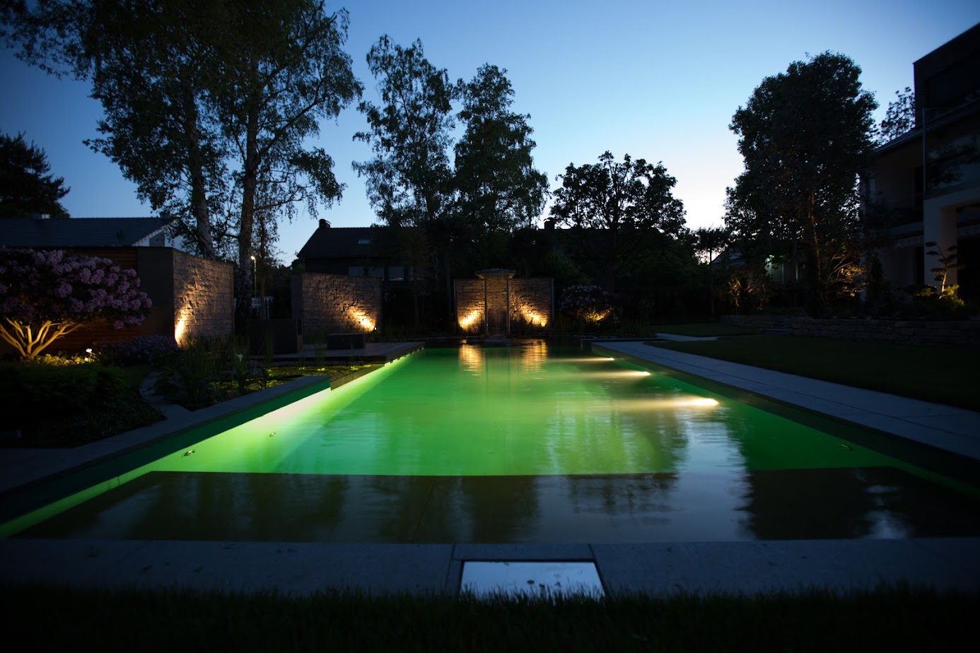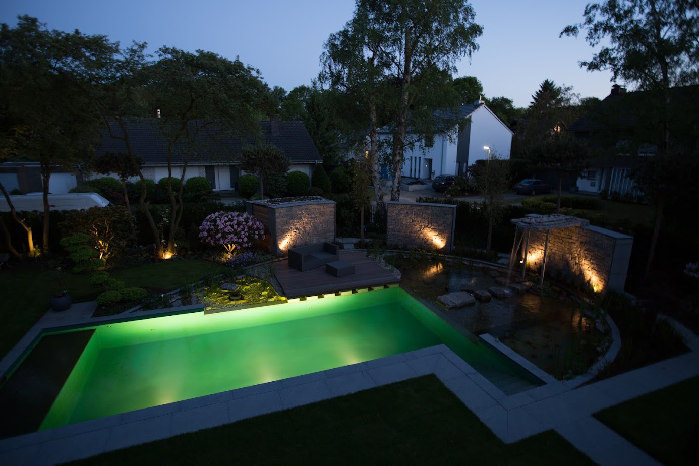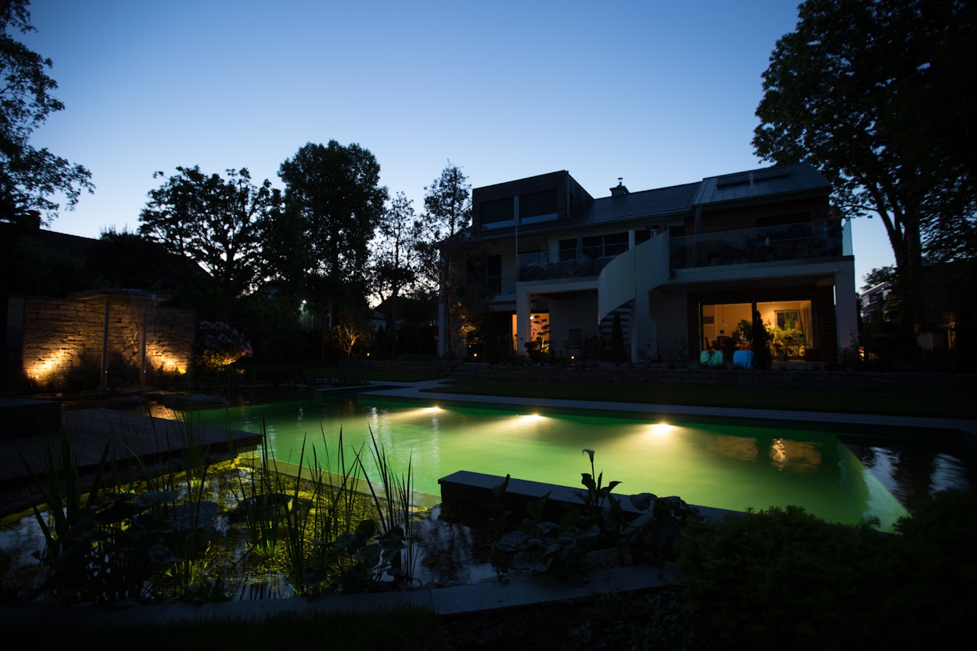 Mit Einbruch der Dunkelheit entfaltet der Garten eine ganz eigene Stimmung. Eine fein abgestimmte Beleuchtung setzt gezielte Akzente: Unterwasserlichter lassen den Schwimmteich leuchten, während ausgewählte Lichtquellen Pflanzen, Mauern und Sitzbereiche hervorheben. Ergänzt durch die Feuerstelle entsteht ein Ort für gesellige Abende, Wärme und besondere Momente – zu jeder Jahreszeit.