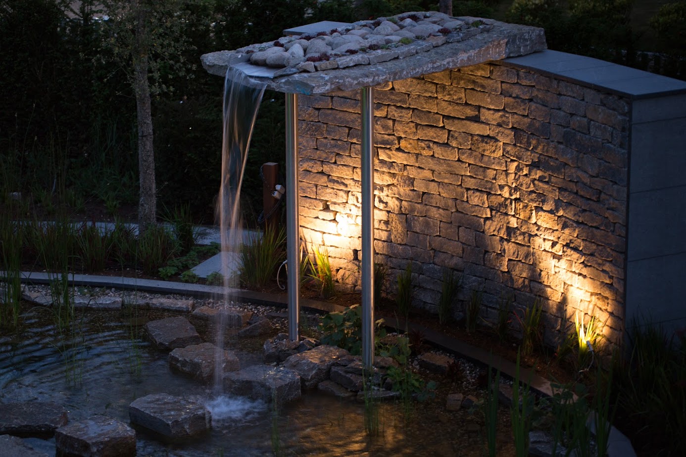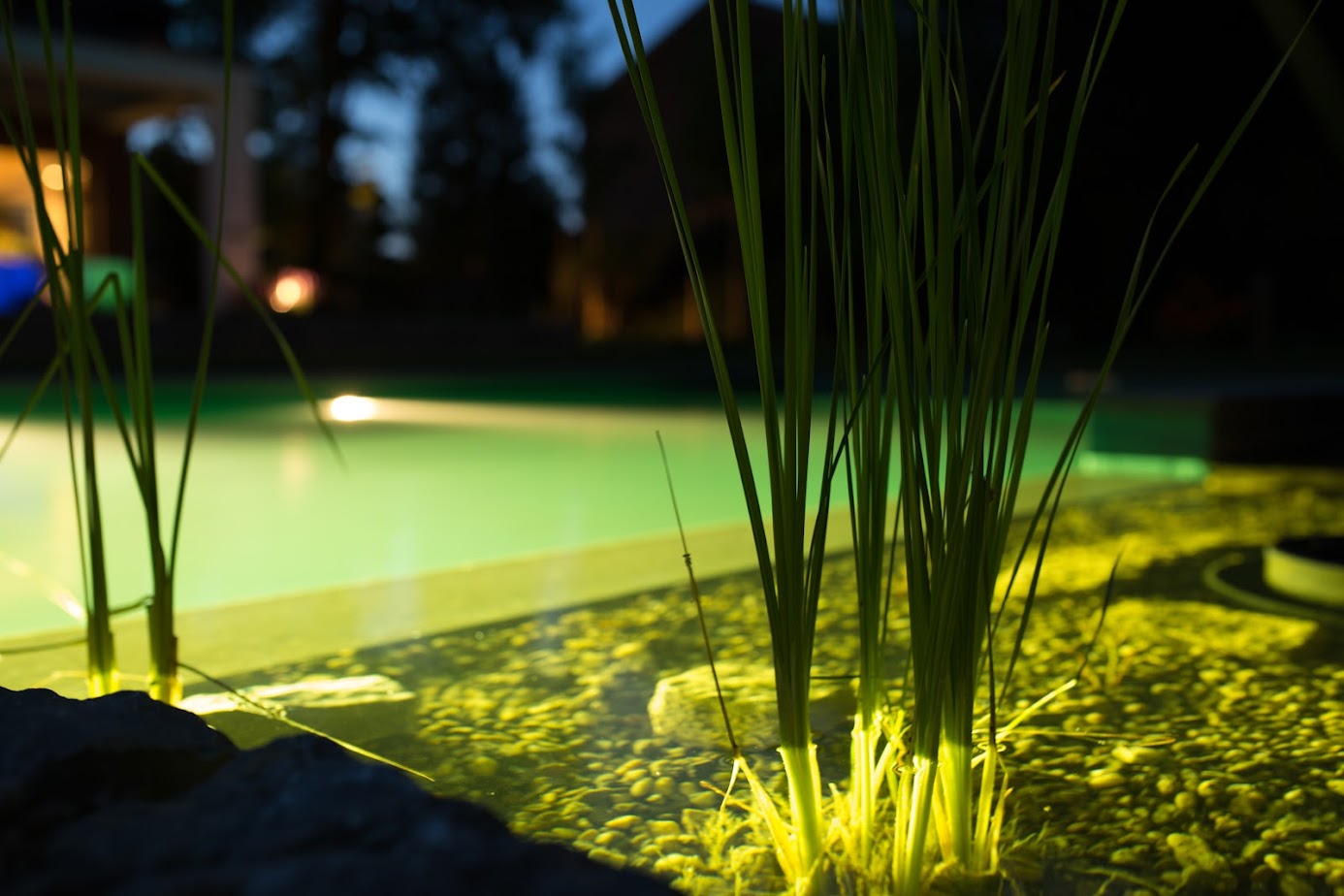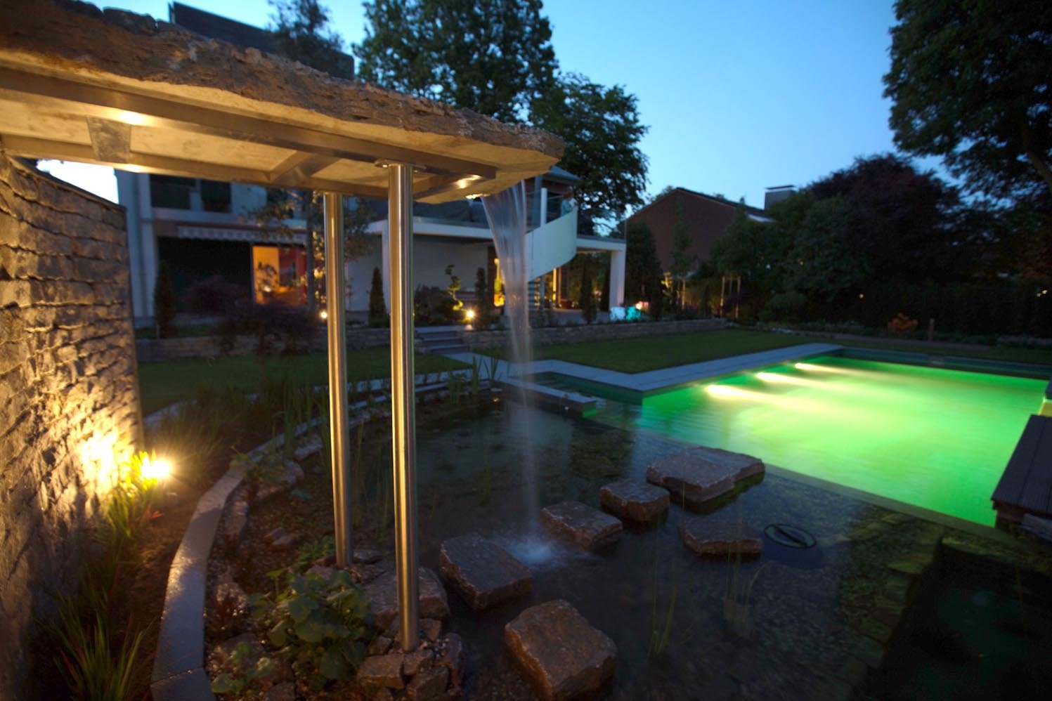 Mit Einbruch der Dunkelheit entfaltet der Garten eine ganz eigene Stimmung. Eine fein abgestimmte Beleuchtung setzt gezielte Akzente: Unterwasserlichter lassen den Schwimmteich leuchten, während ausgewählte Lichtquellen Pflanzen, Mauern und Sitzbereiche hervorheben. Ergänzt durch die Feuerstelle entsteht ein Ort für gesellige Abende, Wärme und besondere Momente – zu jeder Jahreszeit.