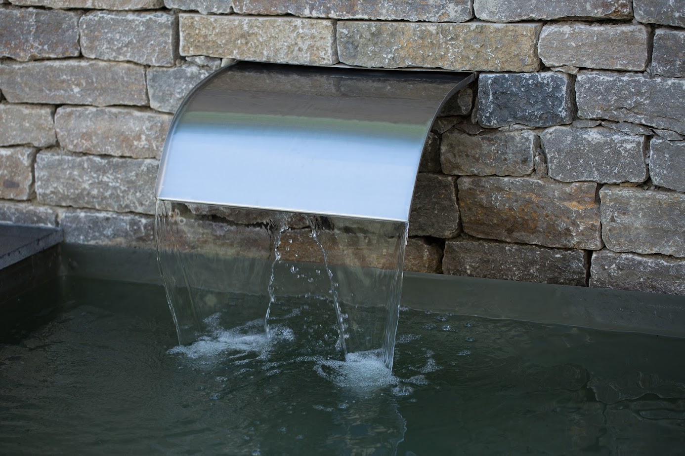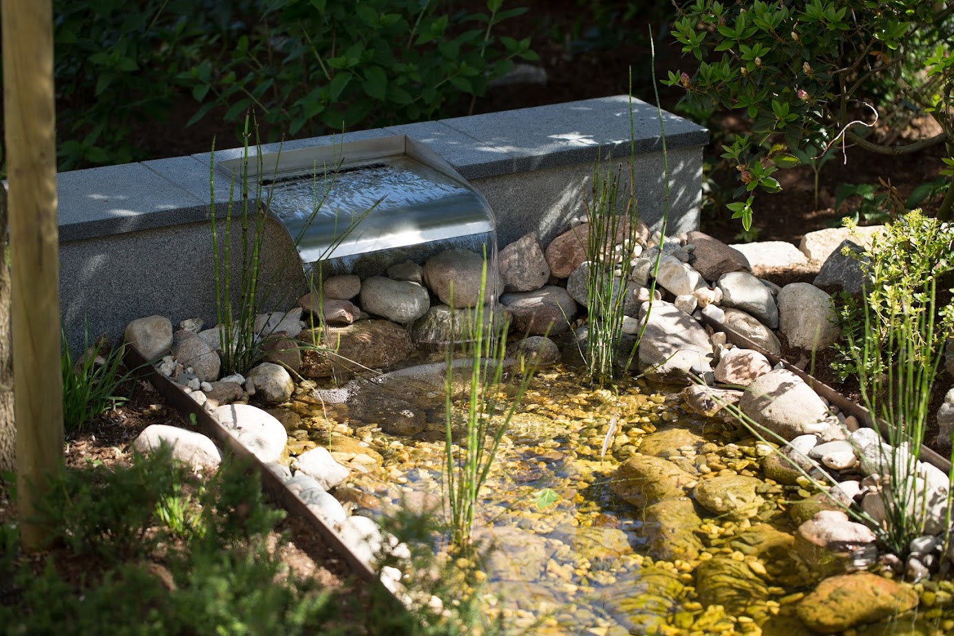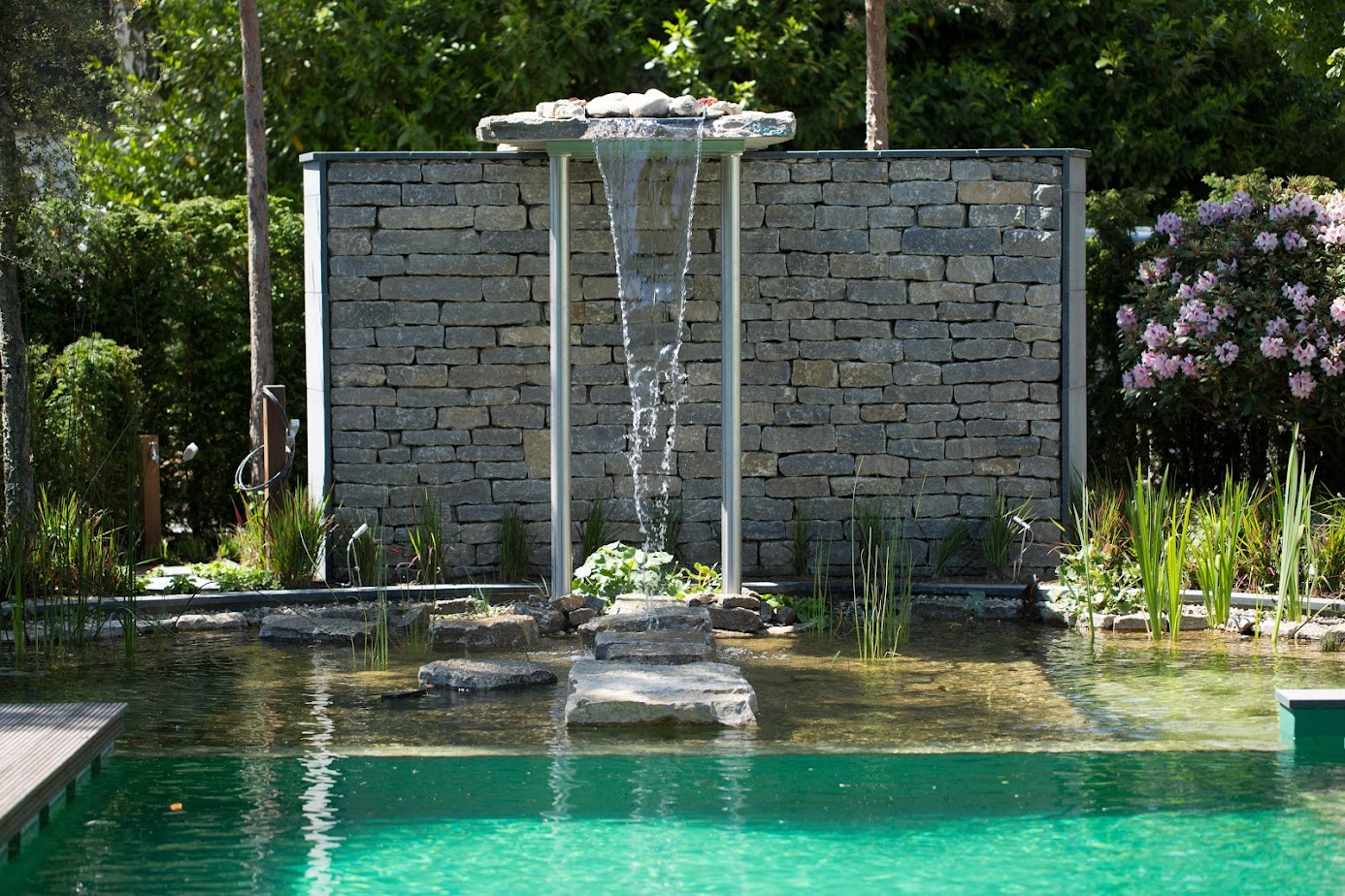 Natursteinmauern übernehmen gleich mehrere Funktionen: Sie bieten Sichtschutz, gliedern den Garten und setzen zugleich kraftvolle gestalterische Akzente. Ein besonderes Highlight ist die majestätische Wasserfall-Dusche, die das Thema Wasser auf eindrucksvolle Weise fortführt und den Garten um ein sinnliches Erlebnis bereichert.