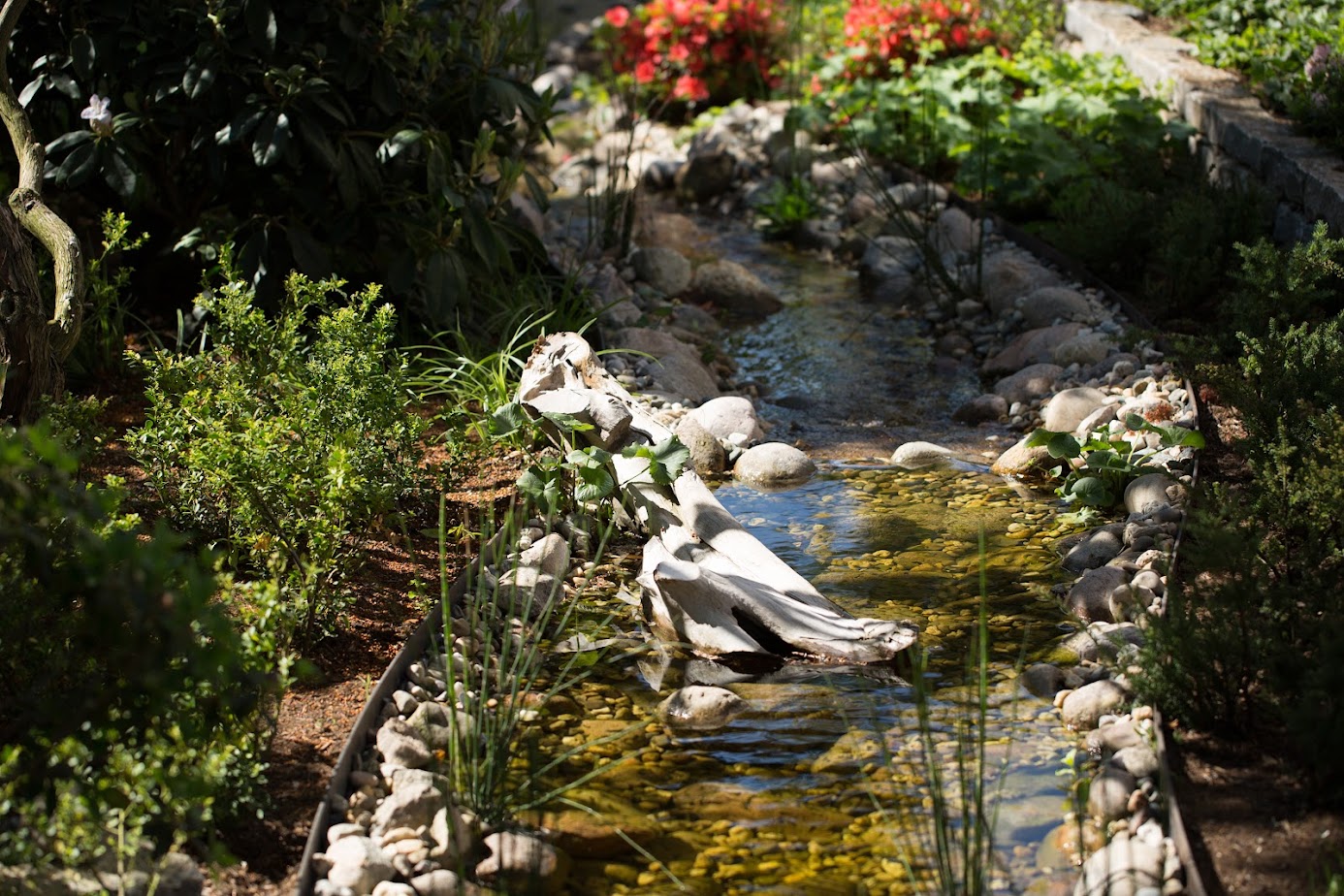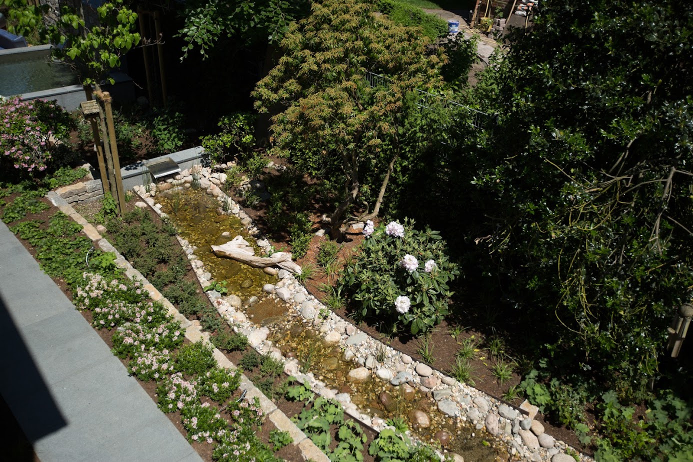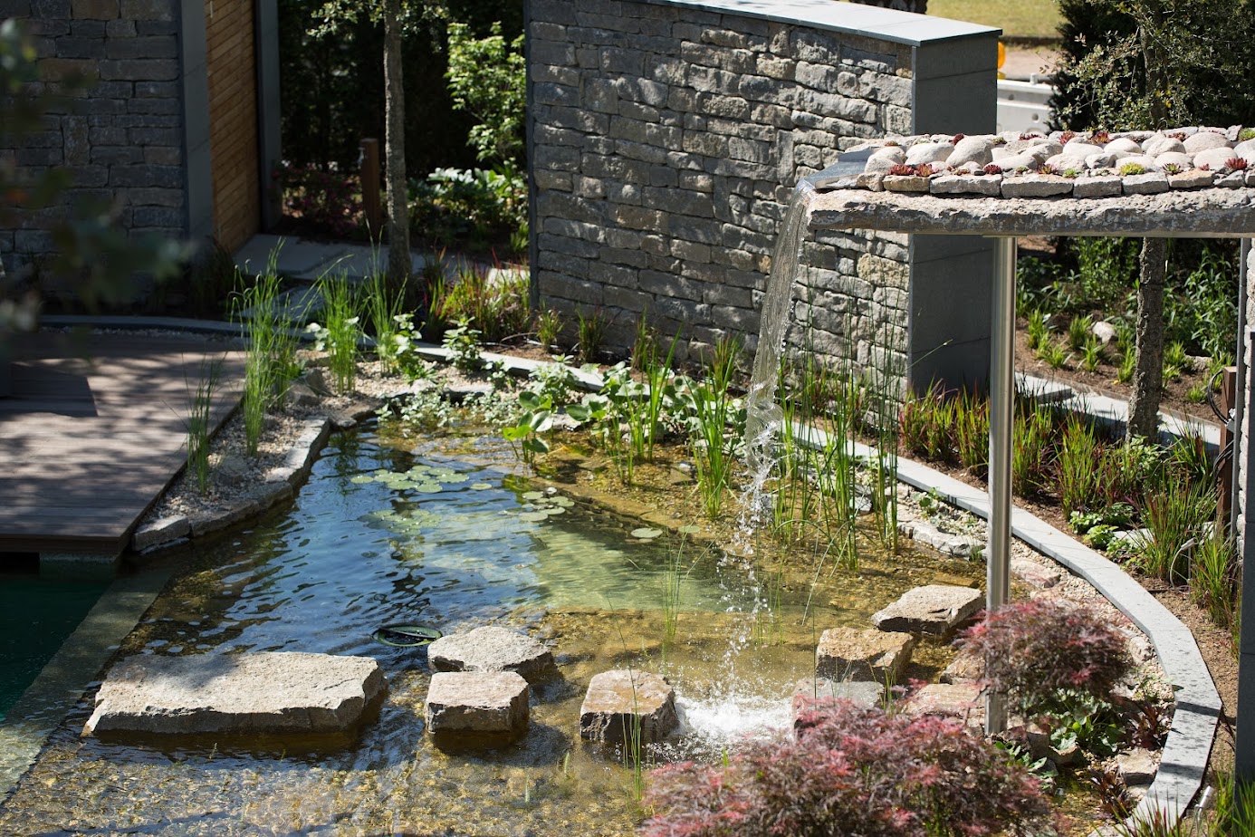 Im Mittelpunkt steht das Element Wasser. Ein beheizter Schwimmteich lädt zu entspannten Bahnen ebenso ein wie zum stillen Treibenlassen. Ergänzt wird er durch einen lebendigen Bachlauf, der Bewegung, Klang und Frische in den Garten bringt. Eine besondere Teichform sorgt dafür, dass alle Generationen im Haus – unabhängig vom Standort – einen ungestörten Blick auf die Wasserfläche genießen können.