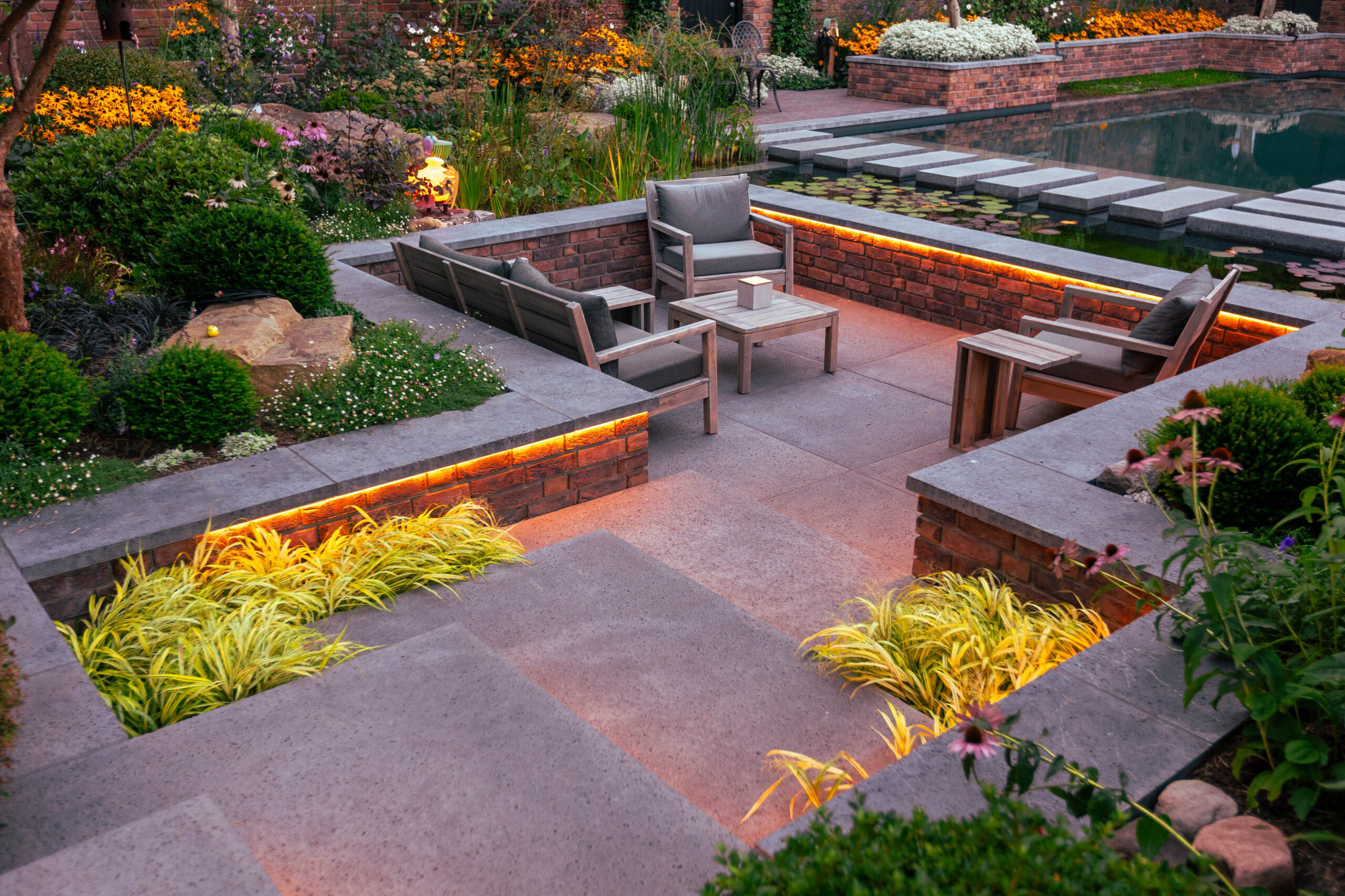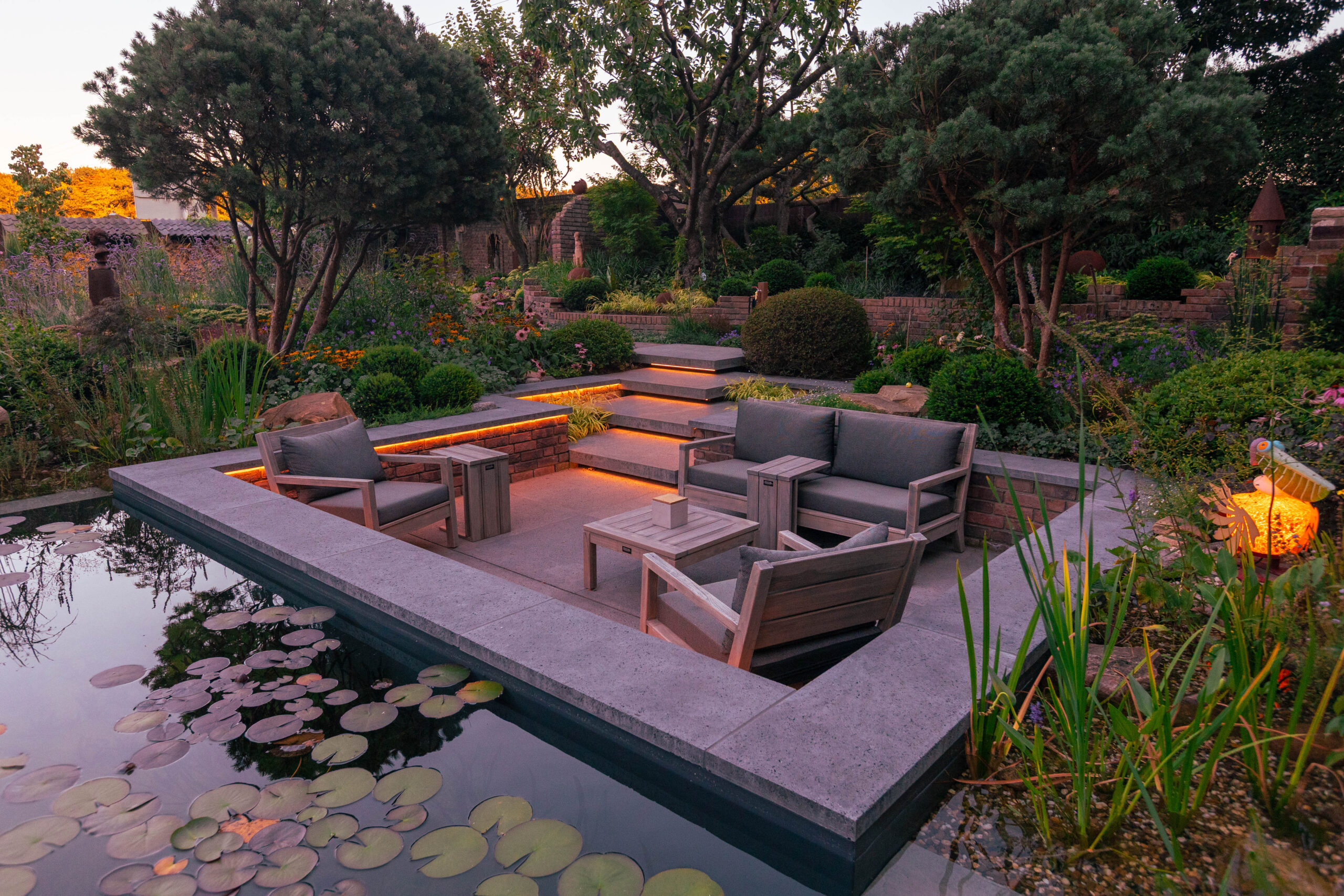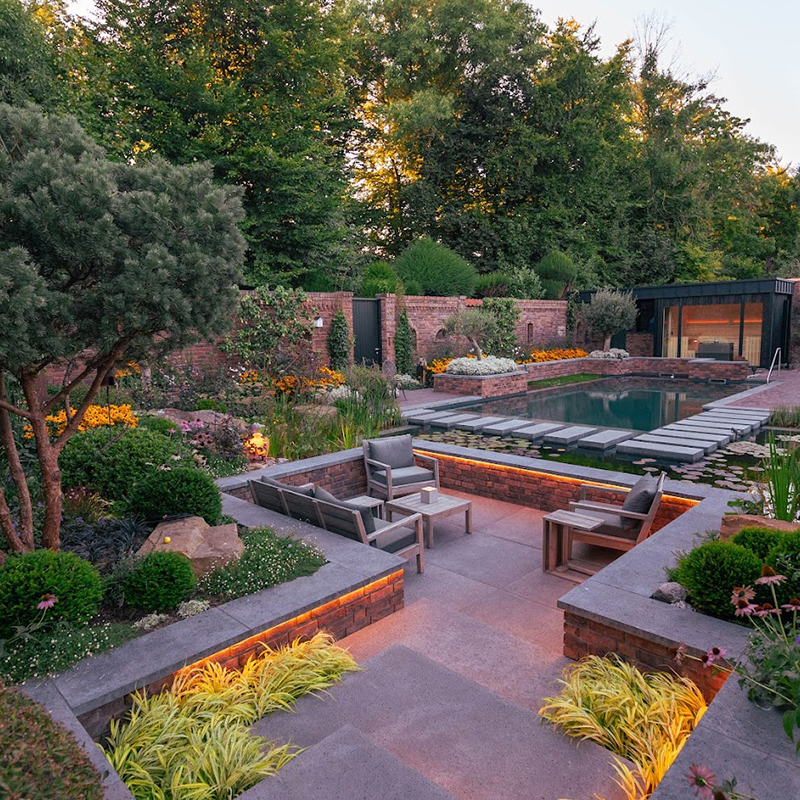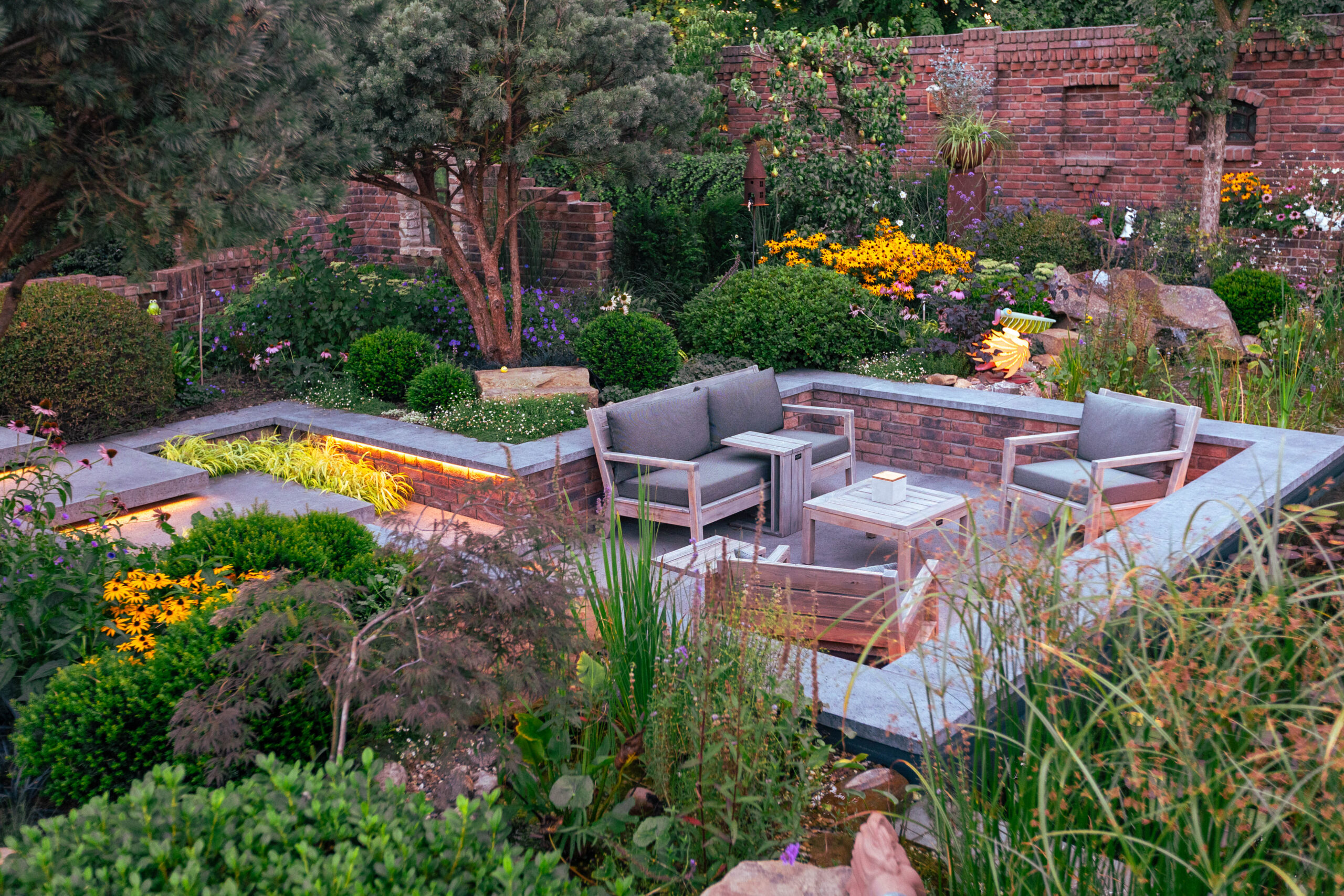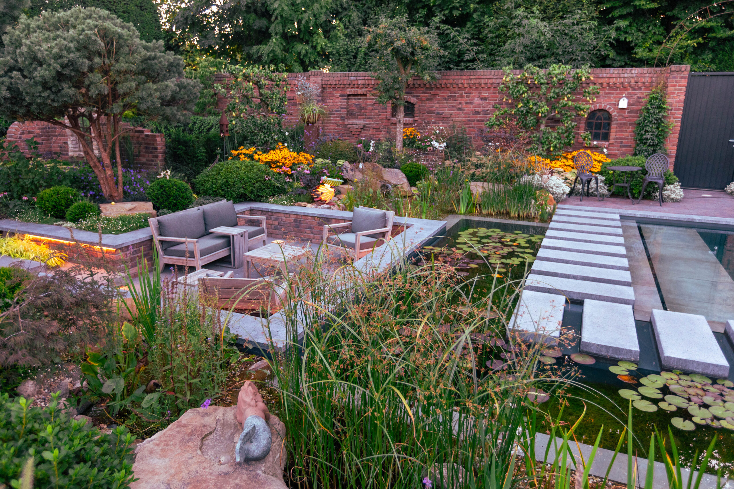 Besonders charmant: auf dem Grundstück gefundene Feldbrandsteine wurden wiederverwendet und als hinterleuchtete „Fenster“ in die Mauern integriert. Sie erzählen Geschichte – und lassen den Garten wirken, als sei er über Jahrzehnte gewachsen.