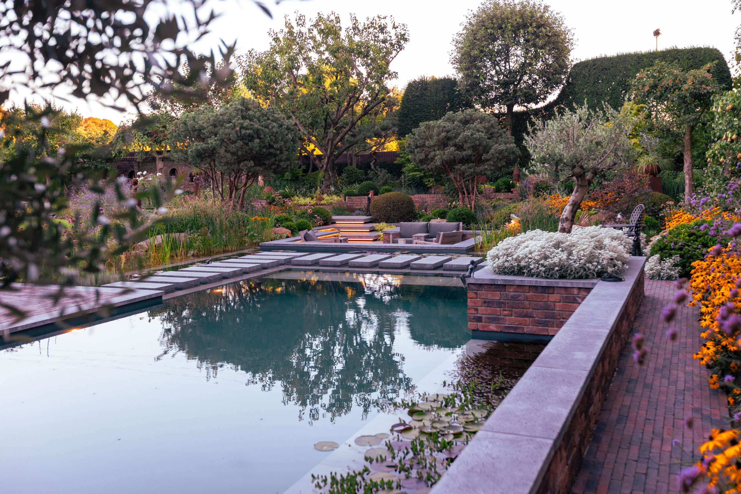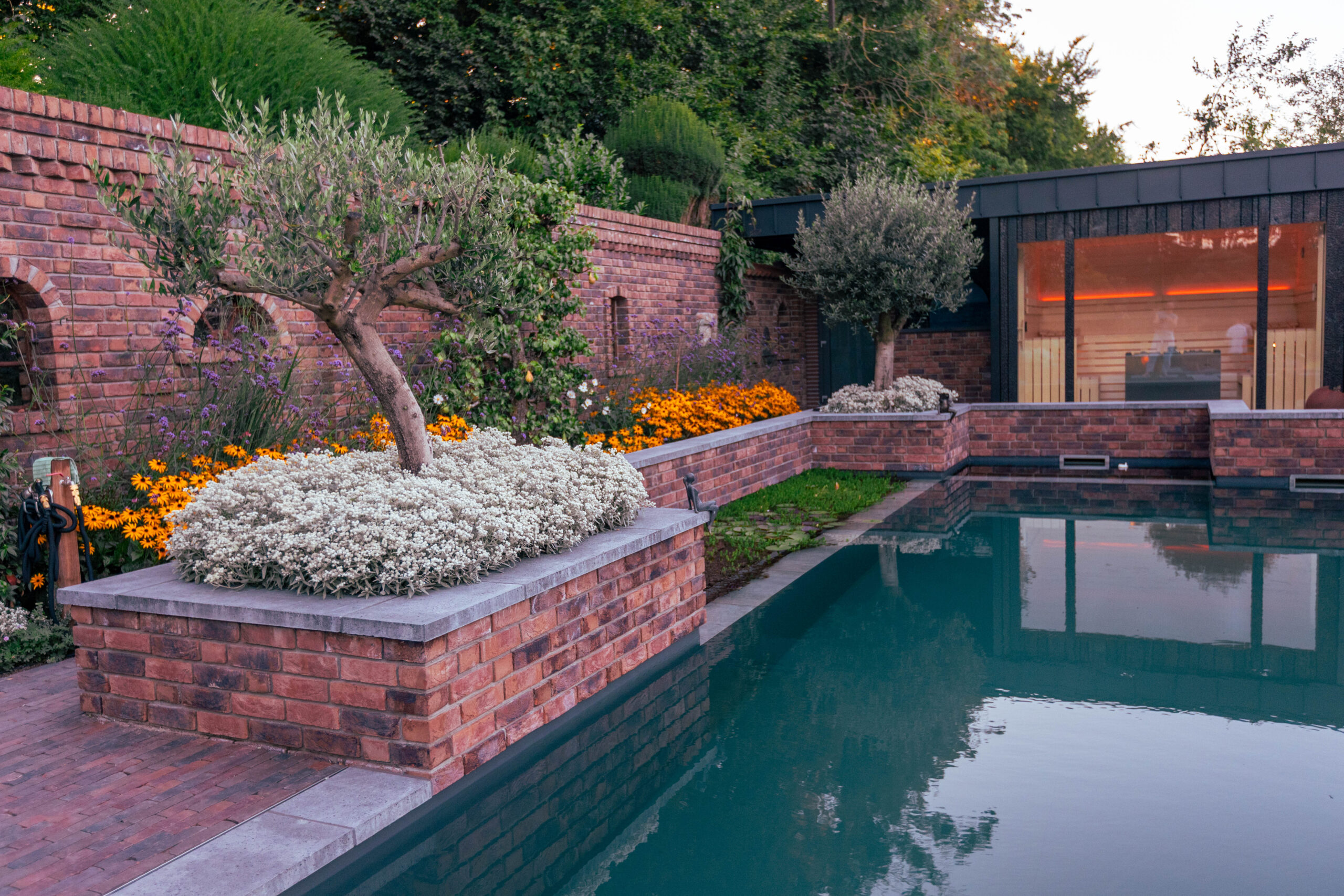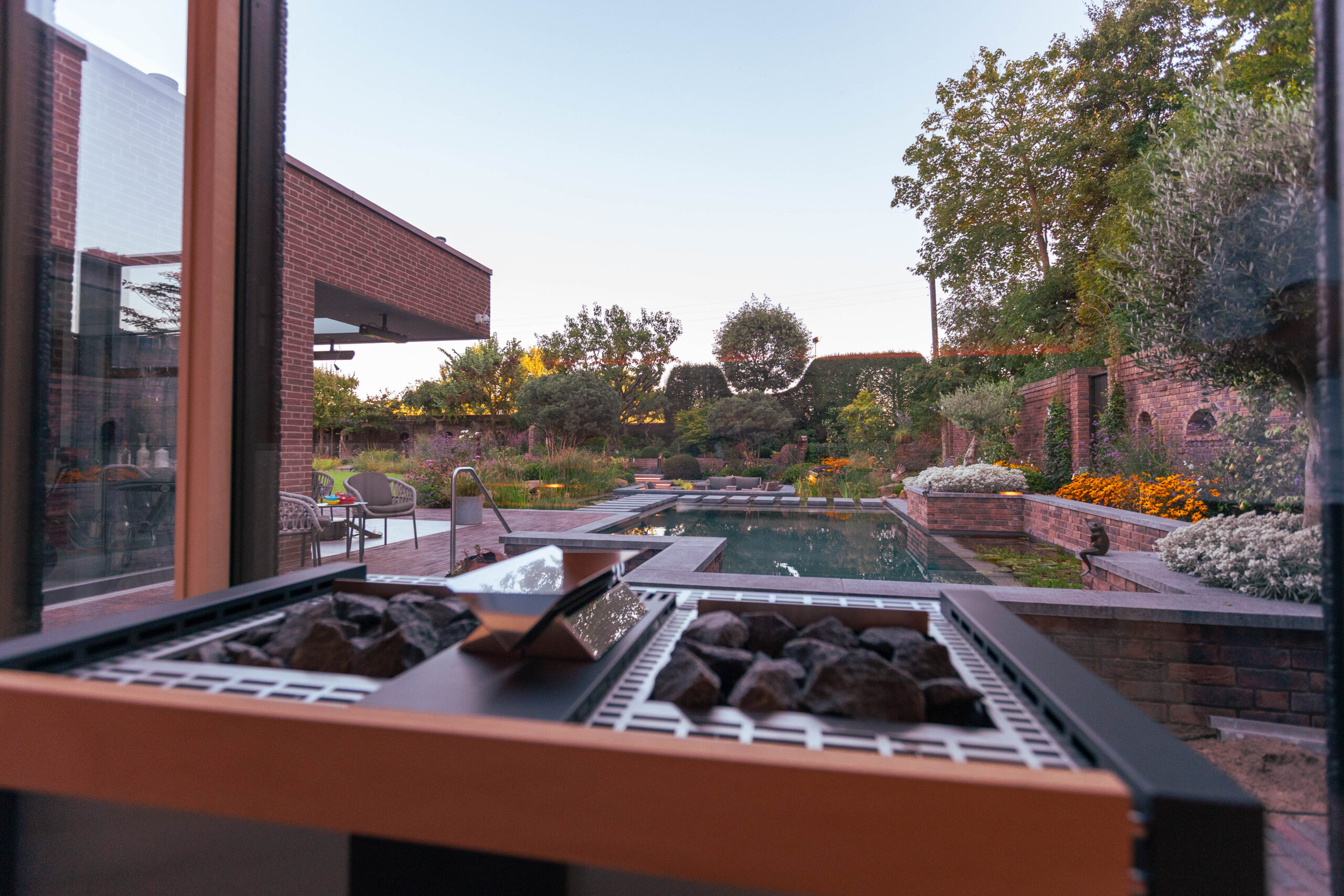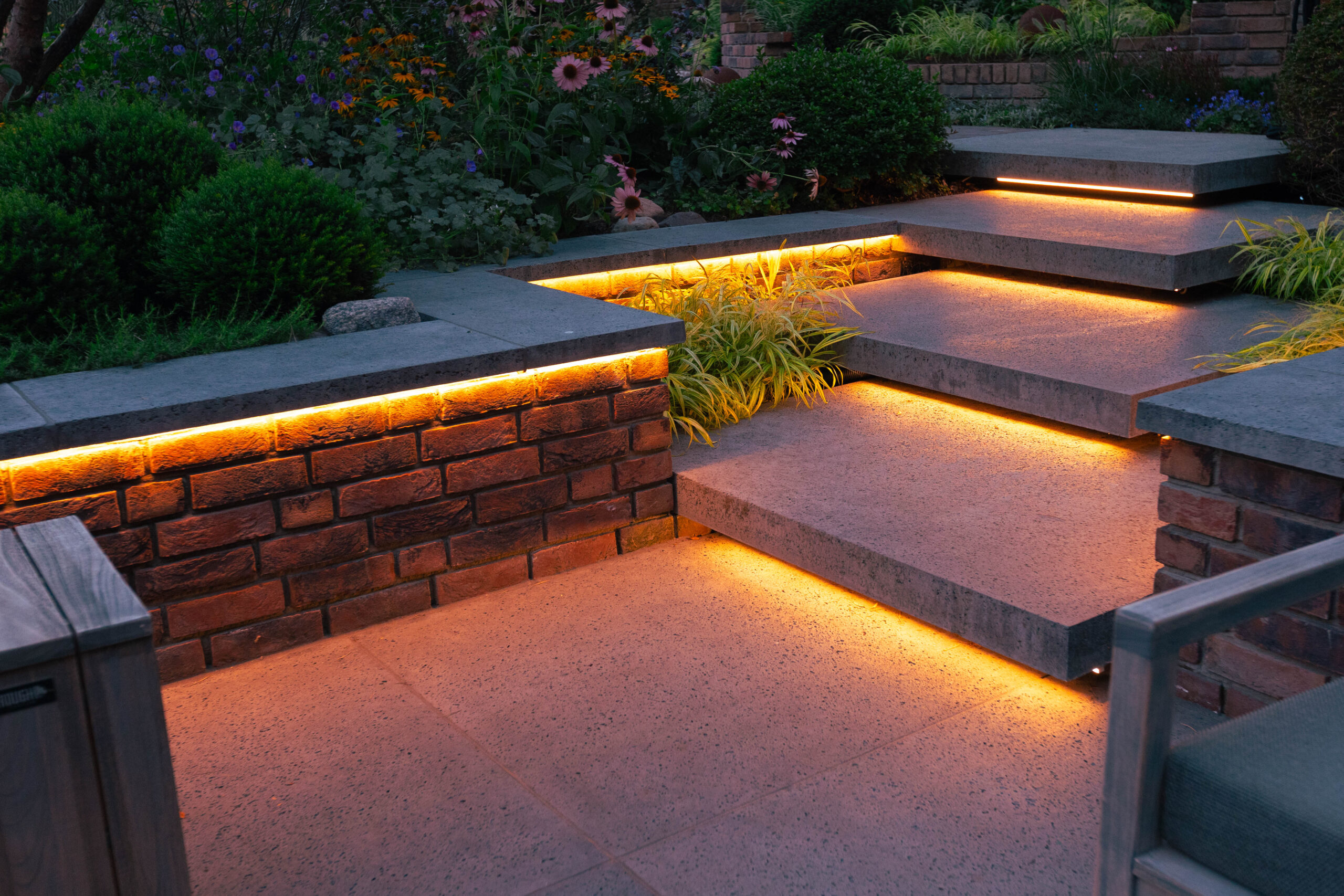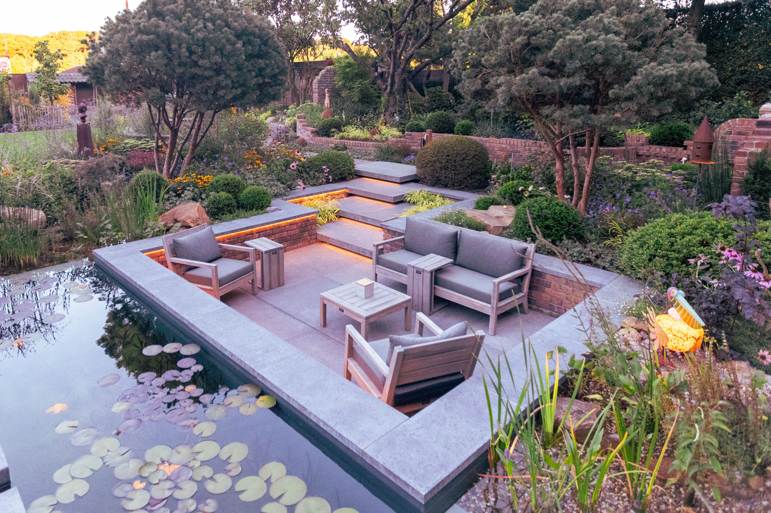 Besonders charmant: auf dem Grundstück gefundene Feldbrandsteine wurden wiederverwendet und als hinterleuchtete „Fenster“ in die Mauern integriert. Sie erzählen Geschichte – und lassen den Garten wirken, als sei er über Jahrzehnte gewachsen.