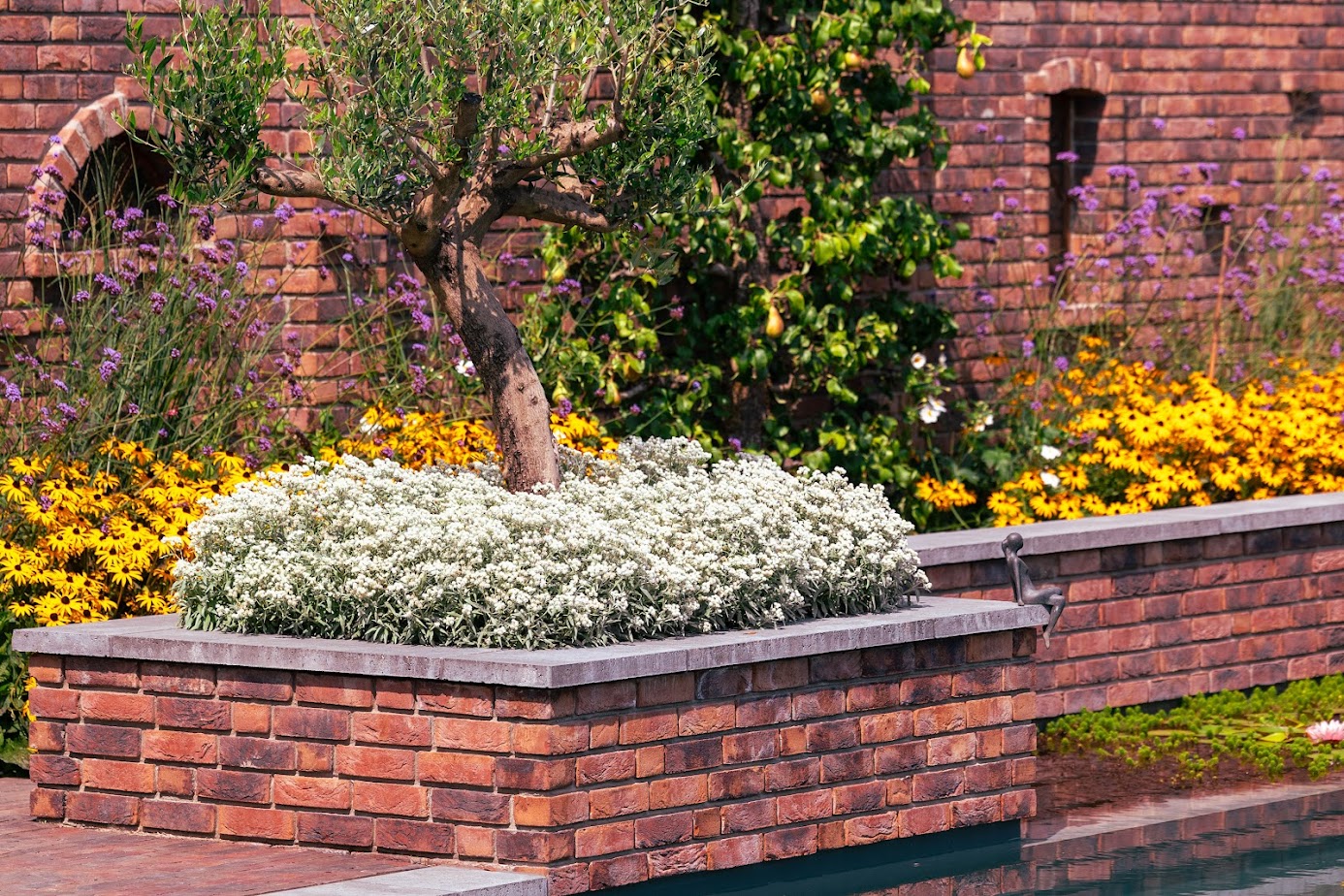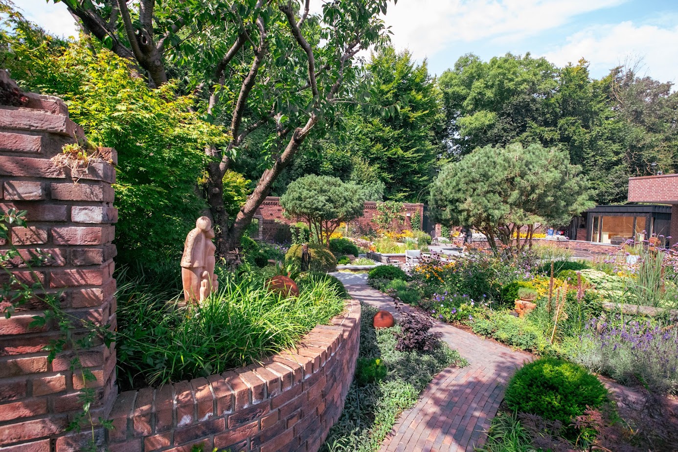 Ein zentrales Gestaltungselement ist der Klinker. Eine historische Klinkerwand des Bestands wurde neu interpretiert und zieht sich heute wie ein roter Faden durch den Garten: