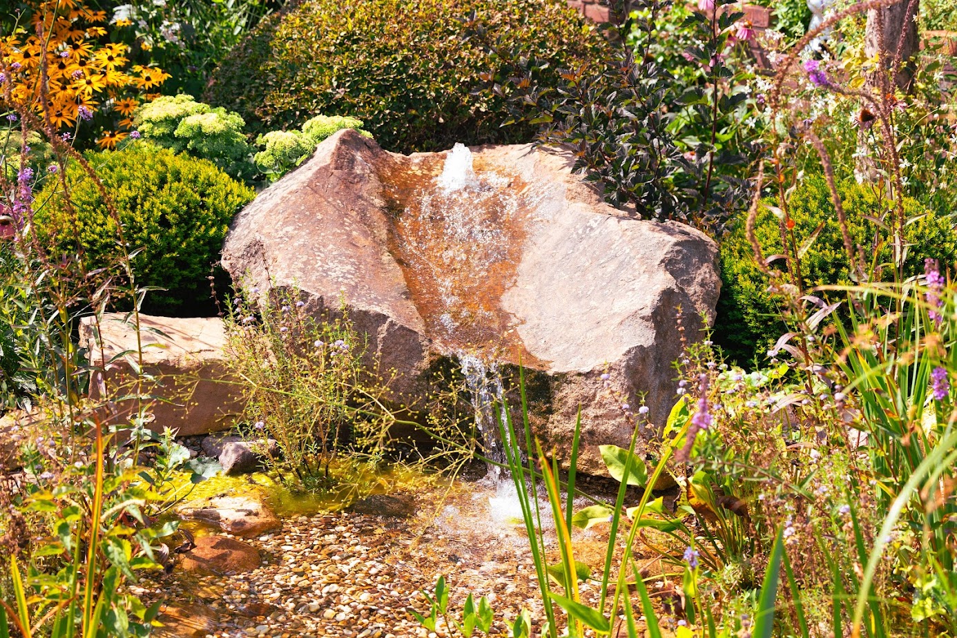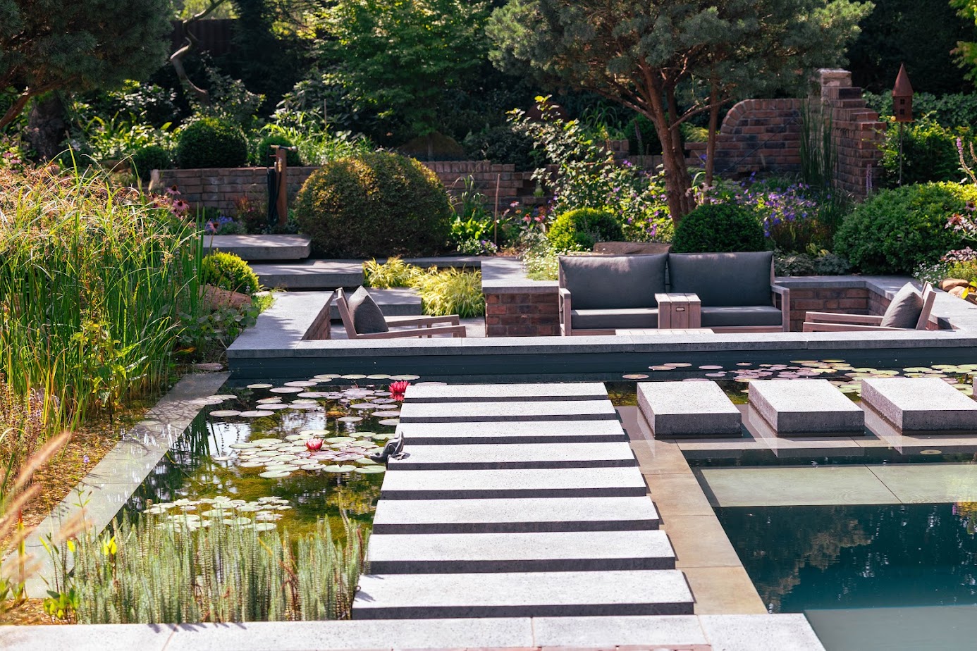 Der gesamte Garten verbindet Schwimmteichanlage und Fischteich. Ein fließender Rundweg führt Besucher durch den Garten – vorbei an Hochbeeten, Mauern und Skulpturen. Jeder Bereich entfaltet seine eigene Wirkung, bleibt aber Teil eines harmonischen Ganzen. Wasser ist Ruhepol, Blickfang und verbindendes Element.